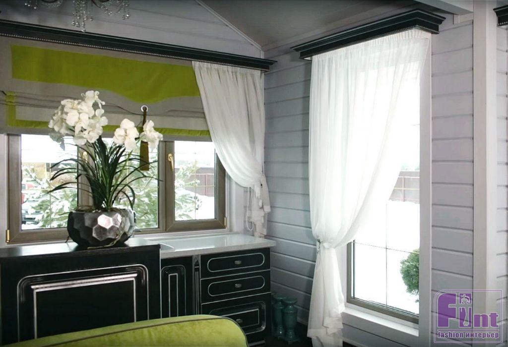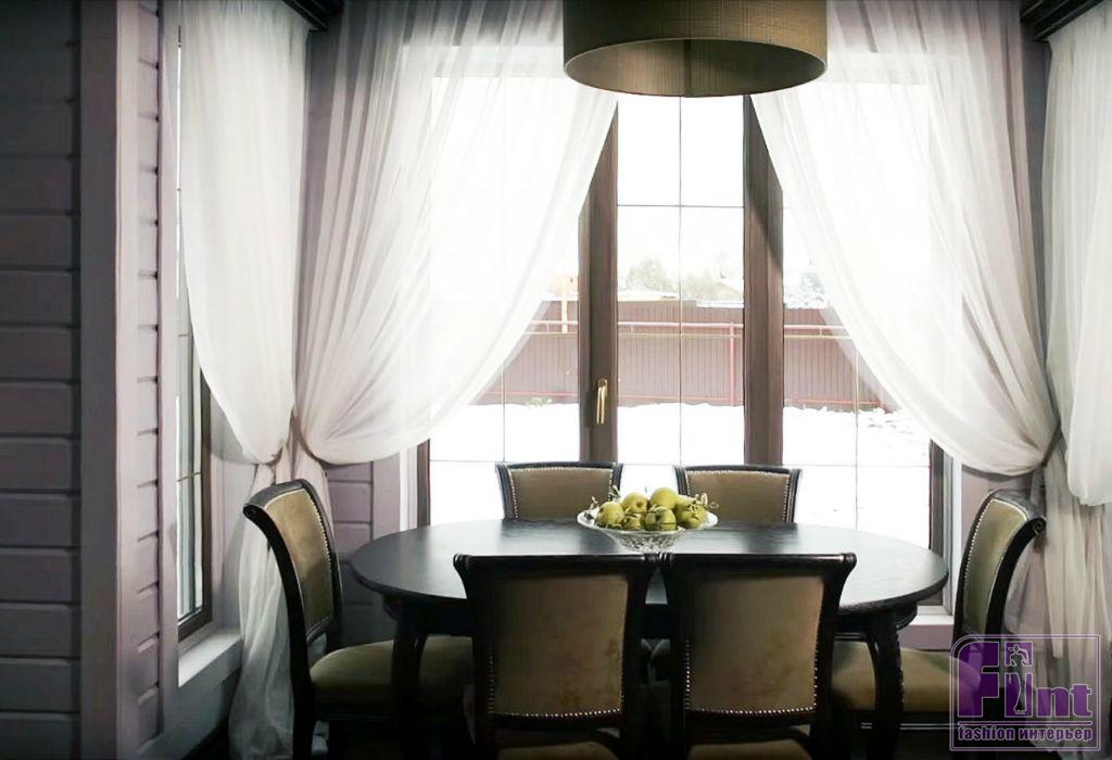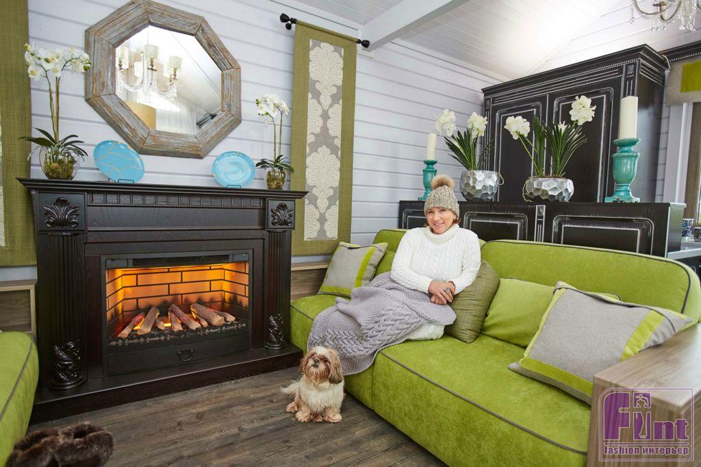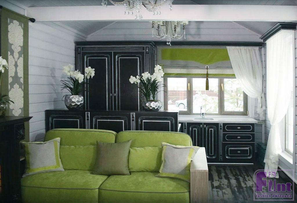 В доме установили мебель. Фасады кухни выполнены из МДФ, сверху они покрыты высококачественной плёнкой цвета черный ясень. Фасады с фрезеровкой и серебряной патиной, которые создают эффект состаренной древесины. Подоконники и столешница выполнены из искусственного камня, он устойчив к царапинам и ударам и в несколько раз прочнее и долговечнее пластика, но не такой капризный как натуральный камень. Раздвижные диваны снабжены надежным механизмом трансформации. Стены украшены необычными панно из жаккардовой ткани м обтачкой из кашемира по краям.
