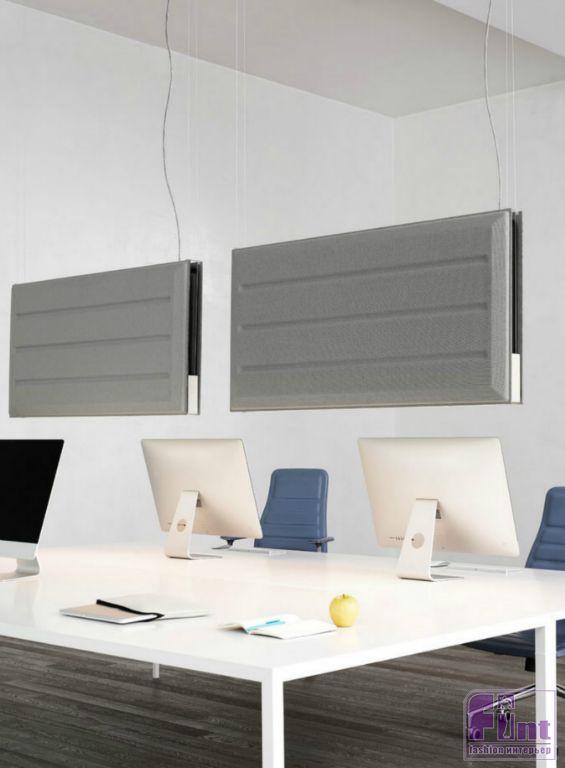 В него вмонтированы акустические системы, поглощающие излишний шум, например офисный, и тем самым обеспечивающие психологический комфорт. Его также можно сложить (как показано на следующей фотографии) и разделить пространство.