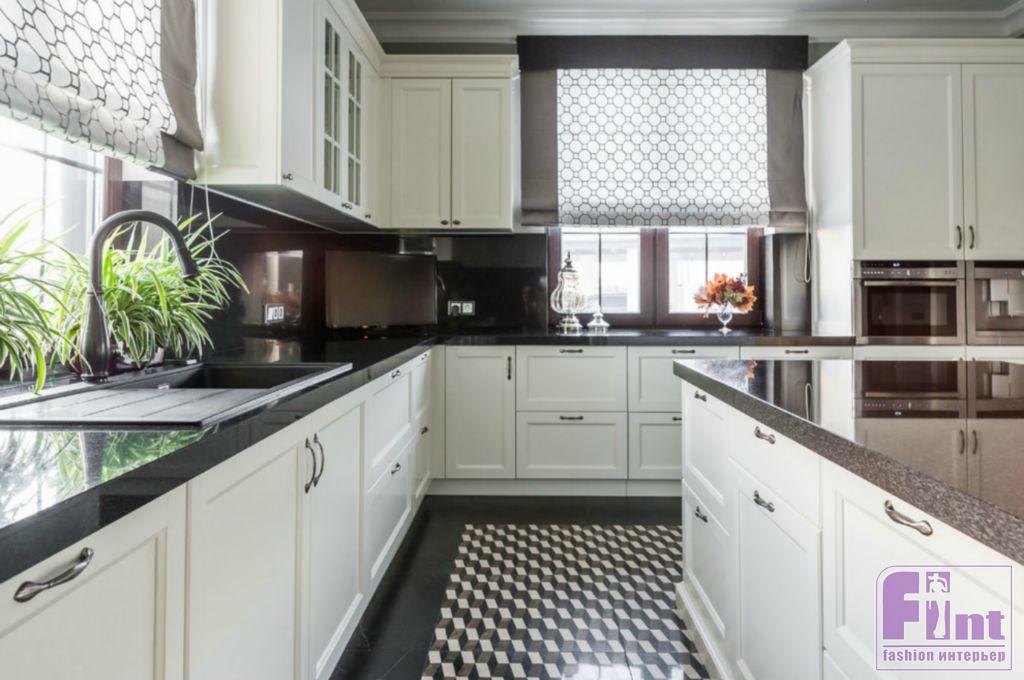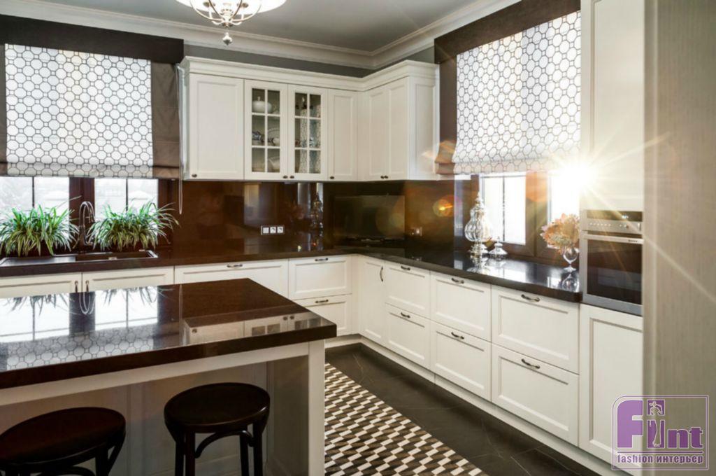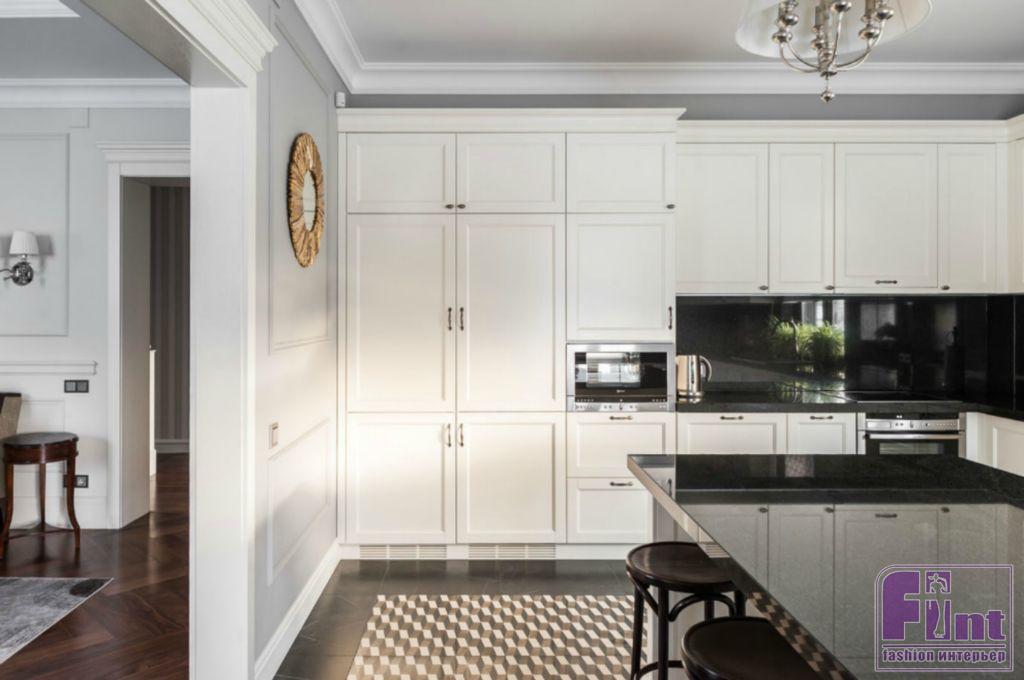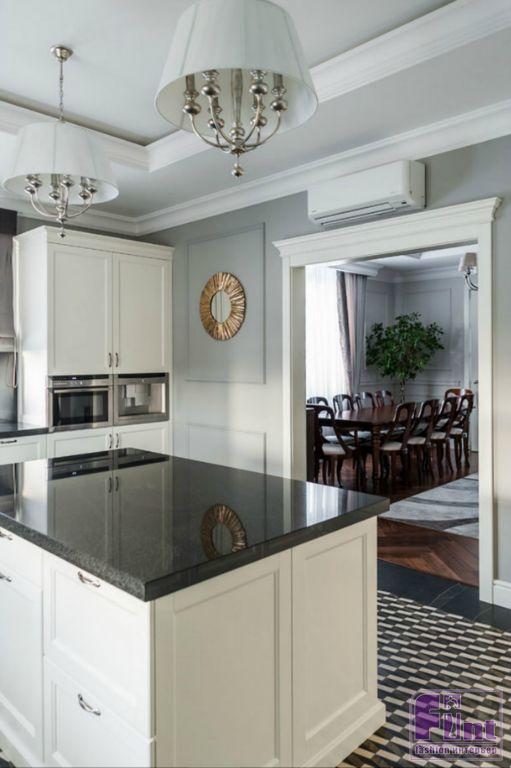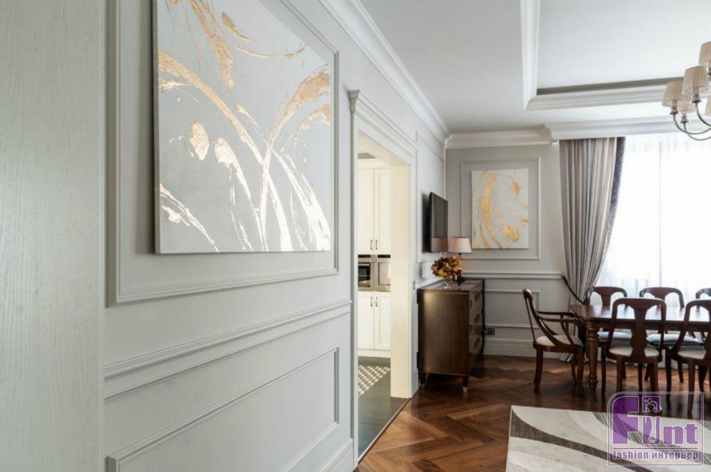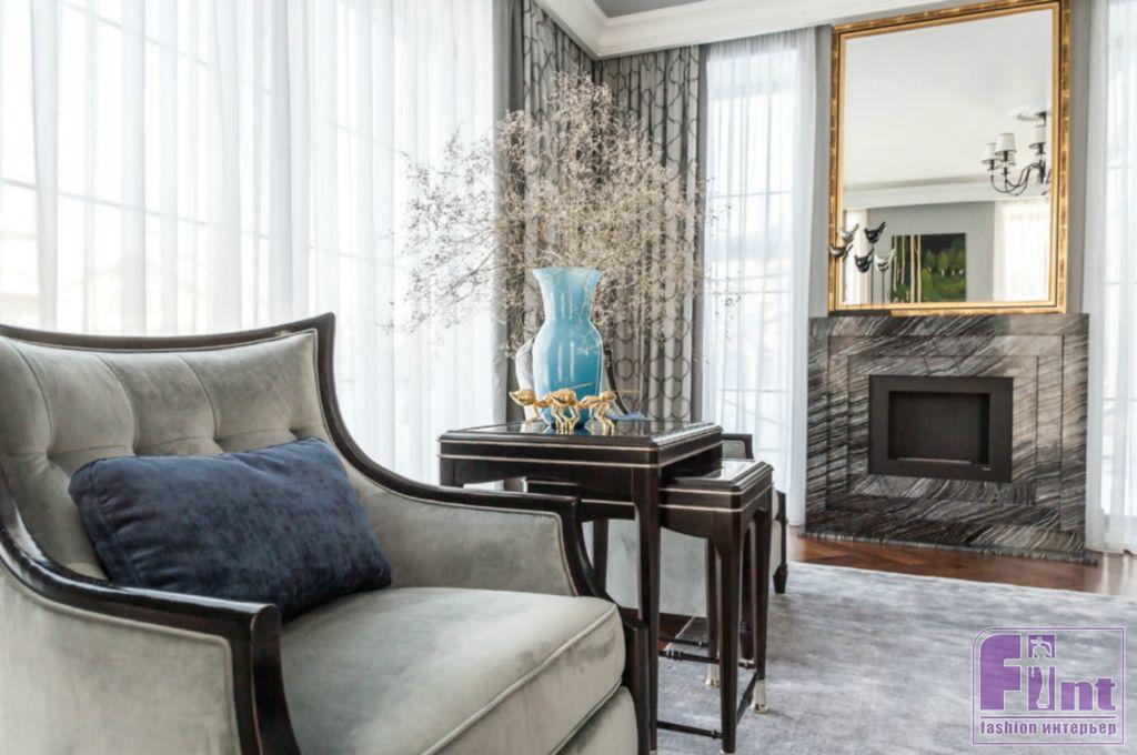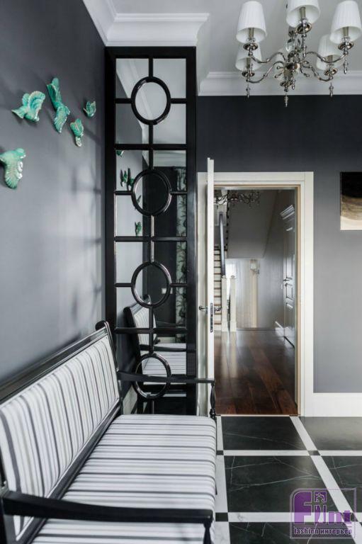 Каждая зона окрашена в собственные цвета, которые удачно сочетаются друг с другом и вместе составляют визуальную целостность. Тёмно-серая прихожая с неповторимой геометрией в стиле ар-деко расположена рядом с розово-серым кабинетом. Из выразительной чёрно-белой кухни по анфиладной оси путь пролегает в просторную столовую, решённую в кофейных, бежевых и золотистых оттенках, и серо-голубую гостиную с неброскими переливами велюра, глянцем стекла и мрамора на каминном портале.