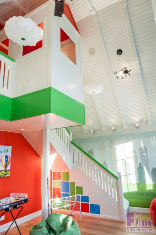 Игровая комната со вторым светом врывается в сдержанную стилистику интерьера неожиданным жизнерадостным пятном. Неожиданность оказывается вполне логичной, если вспомнить, что яркие краски и фантазийные образы для детей гораздо актуальнее, чем элегантный «покрой» интерьера. Однако и здесь Александр не выходит за рамки свойственной ему лаконичности: мебель максимально проста, яркие цвета упорядочены в блоки, а условный город в настенной росписи остаётся в границах реальности и отсылает к эстетике урбанистических небоскребов.