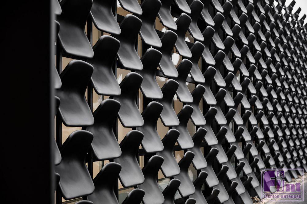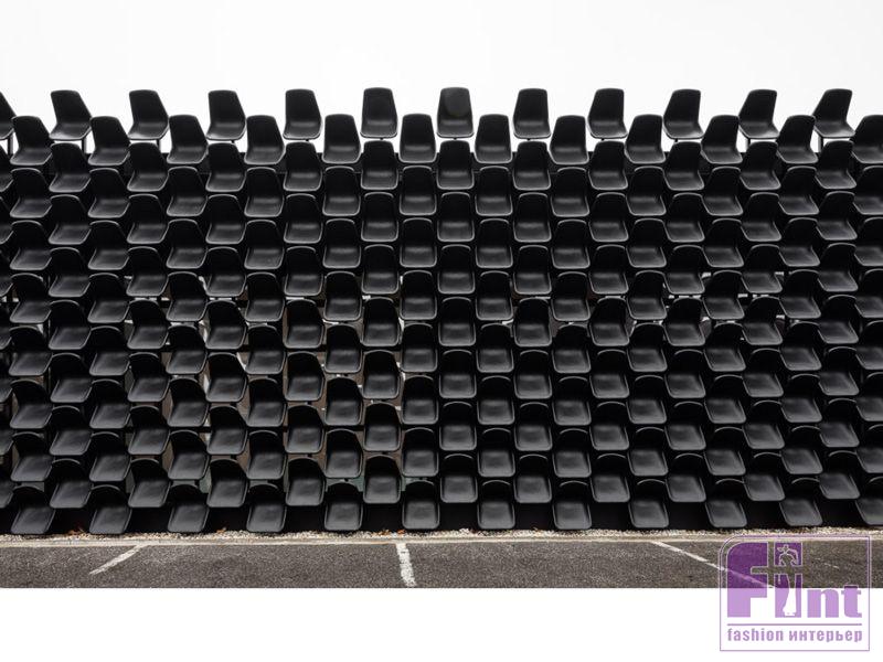 Для отделки переднего и боковых фасадов здания площадью 550 кв. м были использованы стандартные стулья Vicenza стоимостью 80 чешских крон (192 руб.). Каждый из них крепится к стальной конструкции, смонтированной поверх оригинальных бетонных стен.