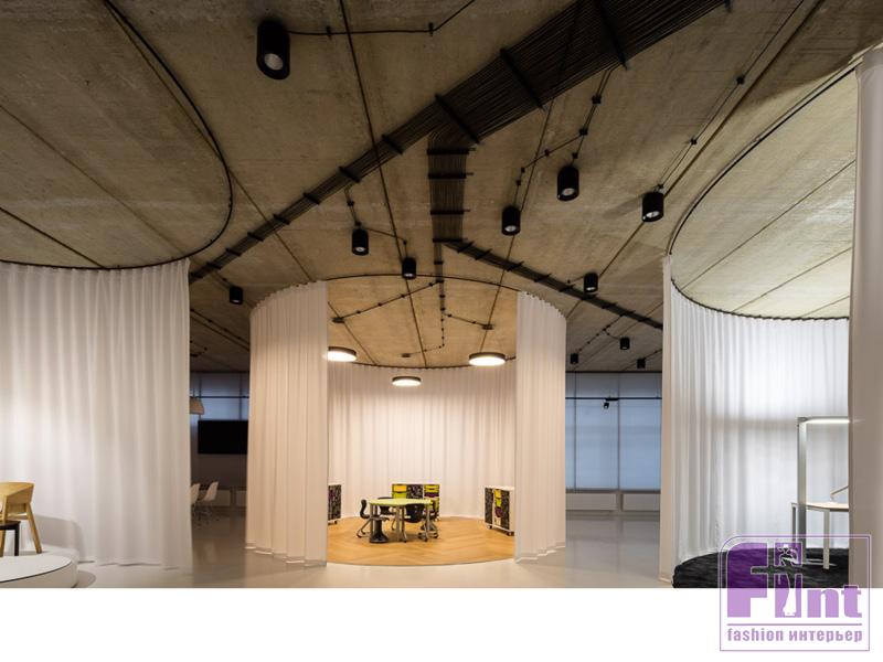 Интерьер оригинального здания также подвергся изменениям. По периметру салона установили поликарбонатные перегородки, отгородившие офисные помещения от шоу-рума. Последнее зонировали с помощью белых занавесок, создав отдельные галереи для школьной мебели, офисной мебели и предметов дизайна.