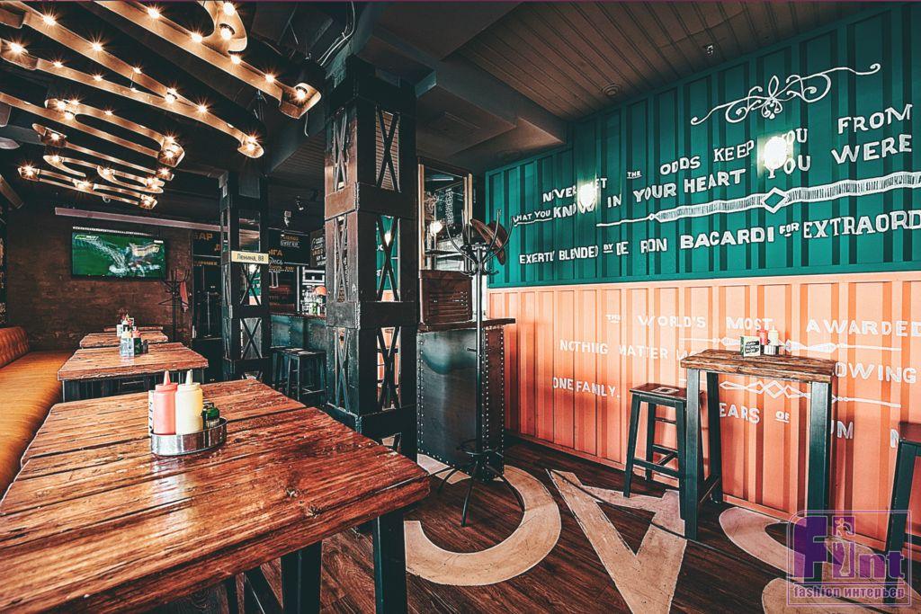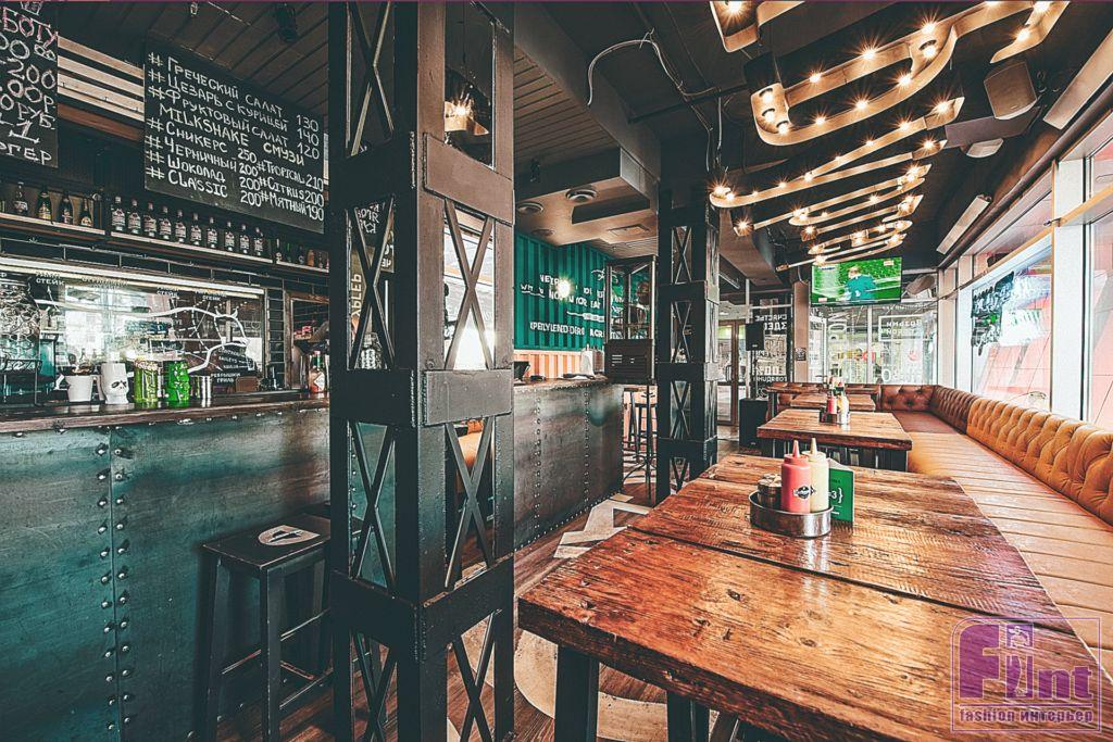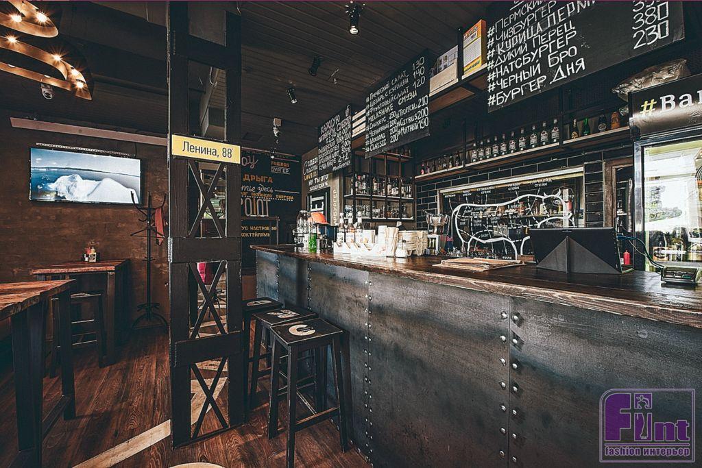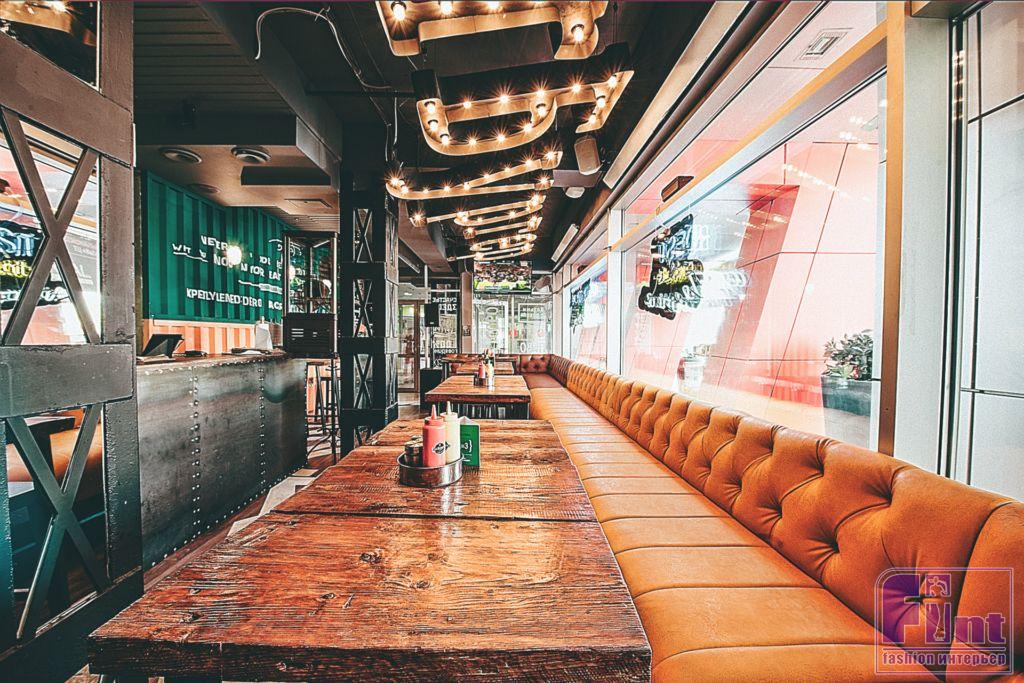 Брутальный интерьер с яркими акцентами для любителей бургеров и вечеринок