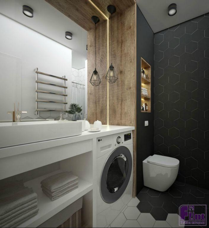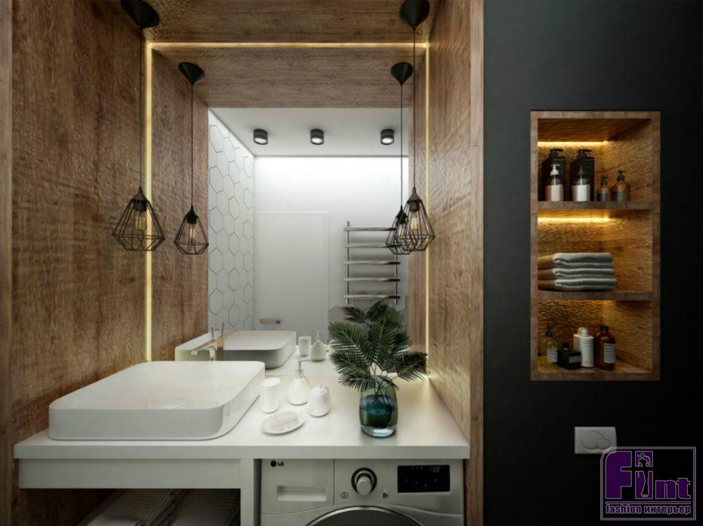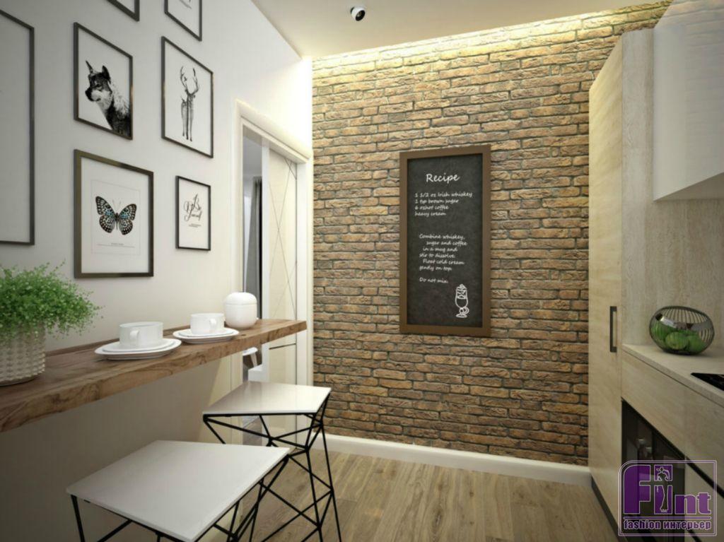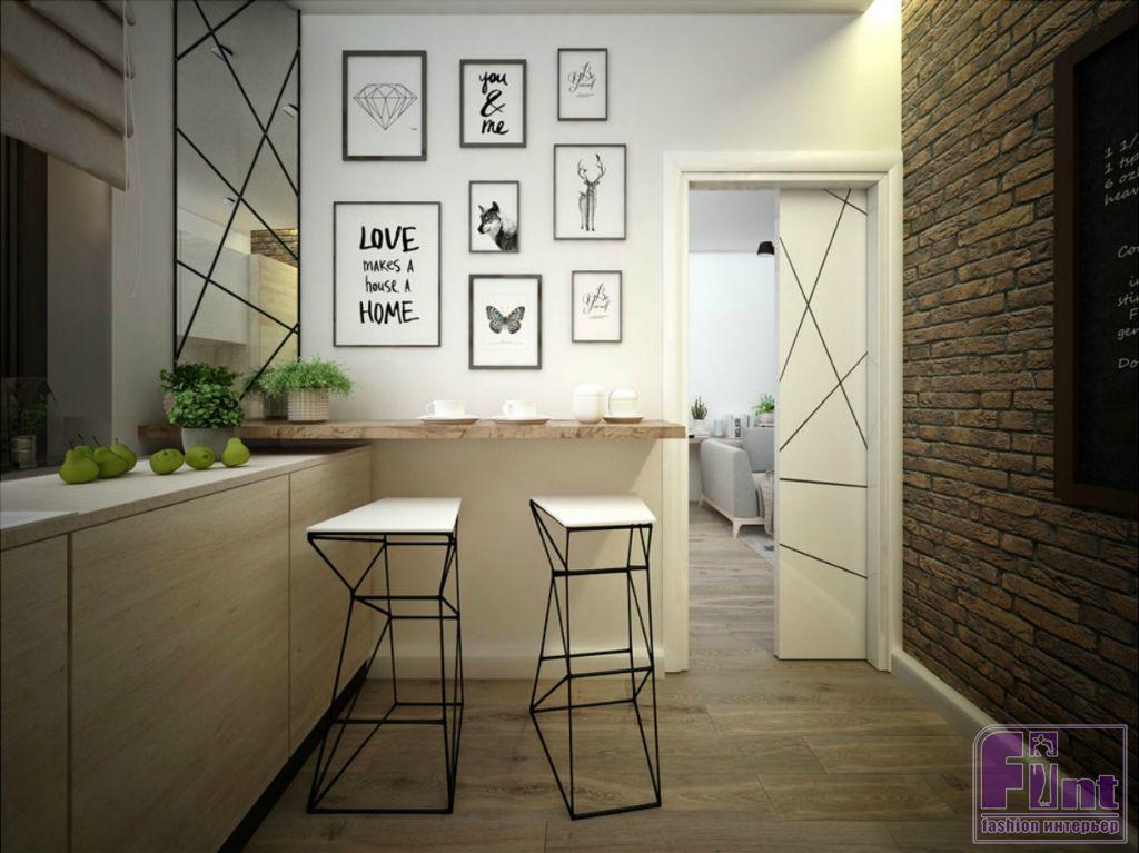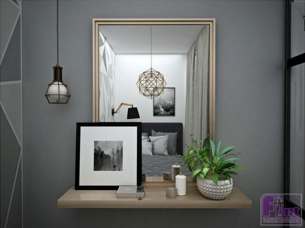 Динамику интерьеру придают контрасты в отделке - окраска стены в полигональный рисунок в спальне, декоративный кирпич в отделке стены кухни, декоративные деревянные рейки с подсветкой в прихожей. Современный декор наполняет пространство уютом и придаёт квартире уникальный стиль.