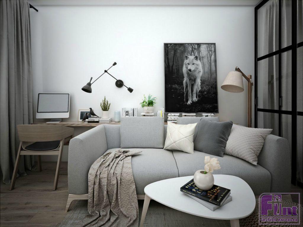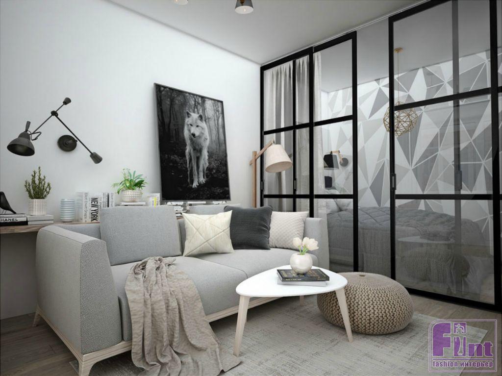 Дизайн однокомнатной квартиры был создан для молодой пары. Стиль квартиры можно назвать Скандинавским с элементами Экостиля и стиля Лофт. По причине небольшой общей площади квартиры, спальня отделена от гостиной стеклянной перегородкой и плотными шторами, что сохраняет естественное освещение спальни, но при этом создаёт ощущение приватности. Дневная зона получает достаточное количество естественного света, благодаря ориентации квартиры на юг.