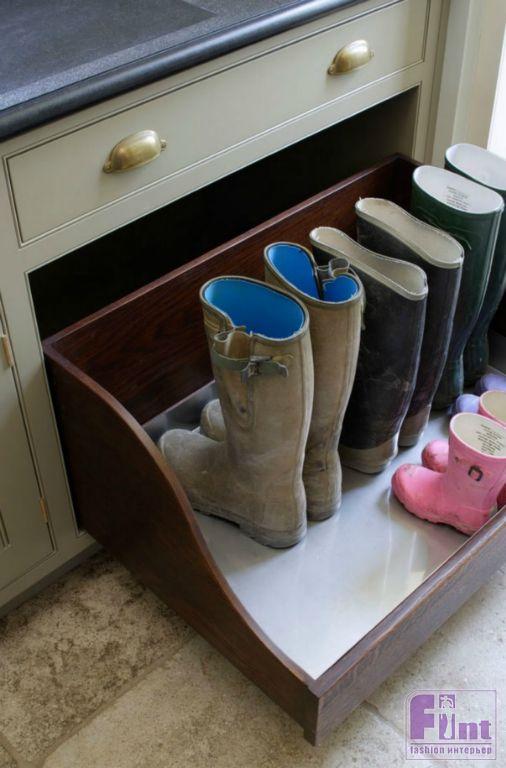 Столпотворение ботинок у входной двери, увы, совершенно не связано с количеством ящиков, которые вы запланировали в гардеробной для сезонного хранения обуви. В тот момент, когда папа, мама, двое детей и бабушка достали свои «две пары», промочили одни ботинки утром и успели сходить в магазин (на урок танцев, выгулять собаку…) в других ботинках — в прихожей случается стихийное бедствие в виде горы грязной обуви.