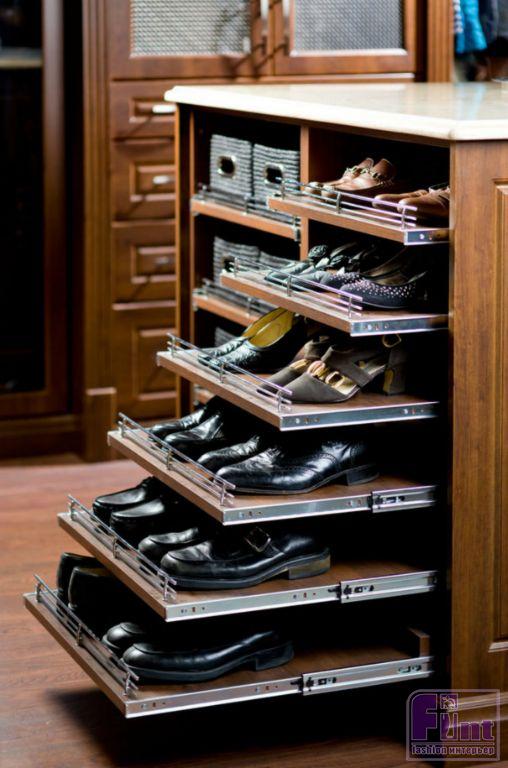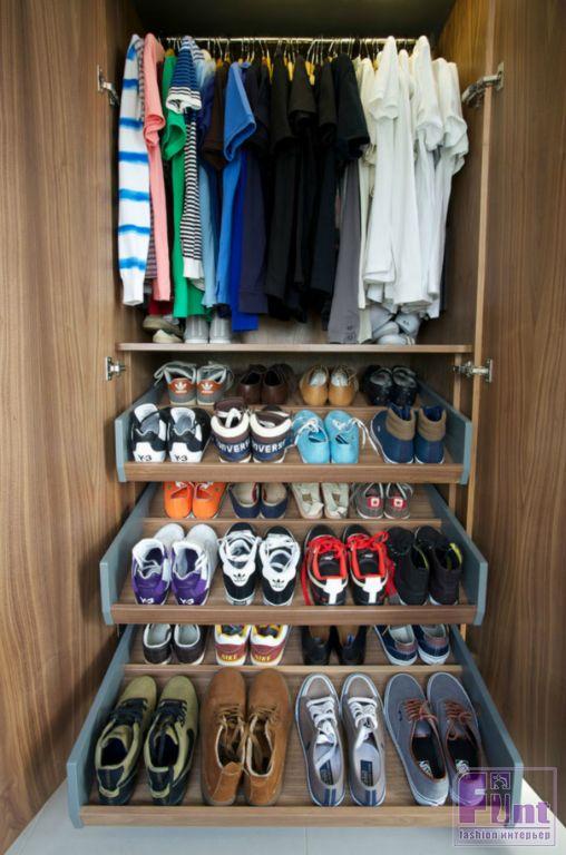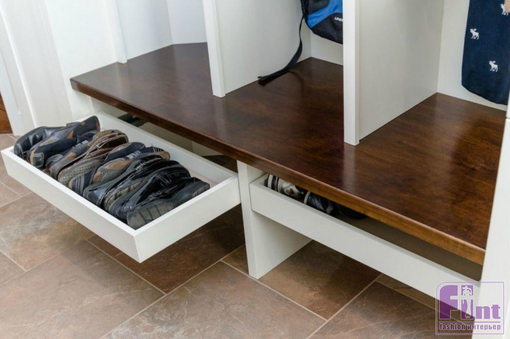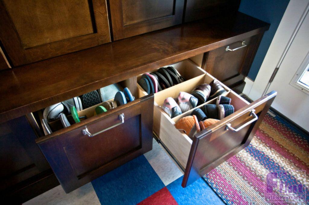 Если вы ограничены в метрах, откажитесь от полок! Способ хранения в выдвижном ящике позволяет вместить больше пар на единице площади. Замените внутреннее наполнение стандартной тумбы для прихожей — вместо обычных полок установите выдвижные ящики с нужным вам интервалом. Вы получите возможность аккуратно хранить туфли и ботинки, а закрытый фасад ящиков решит проблему оседающей пыли.