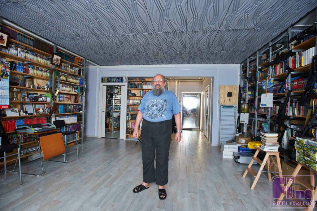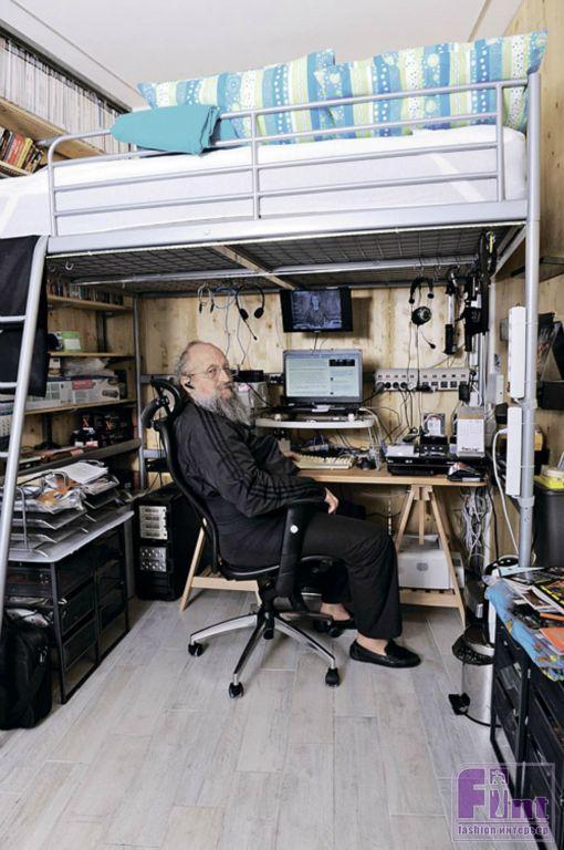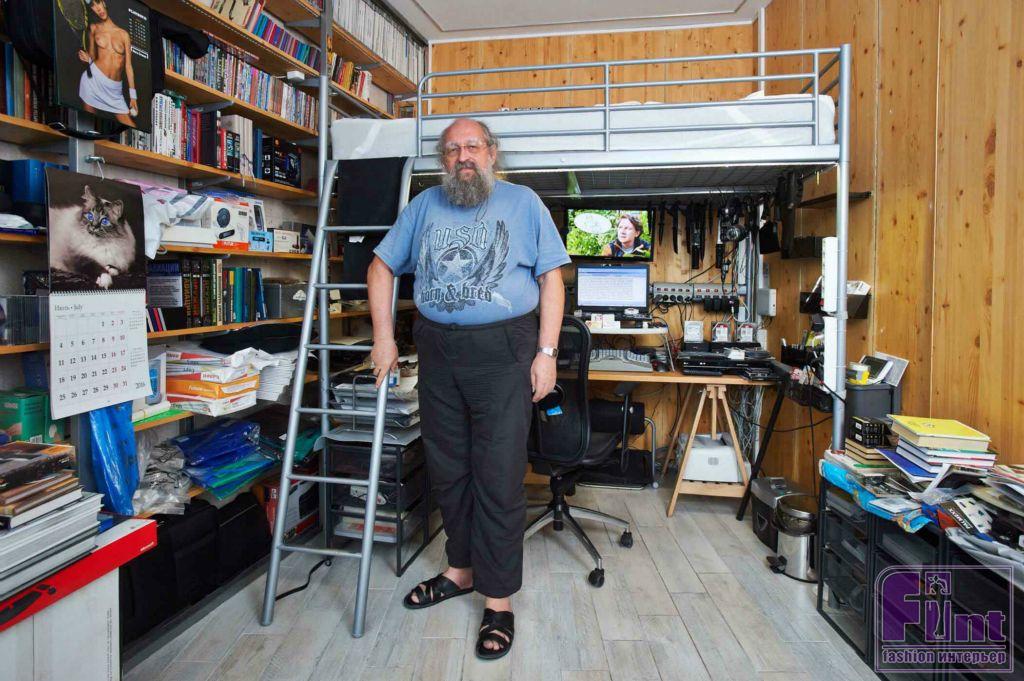 Вассерман предлагает нам посмотреть, как оборудована та комната, где он проводит большую часть своего времени — работает и спит. Сразу же отмечаем, что стены помещения отделаны деревом. Стеллажей с книгами тут не меньше, чем в гостиной, хотя по площади комната небольшая. И чтобы сэкономить место Анатолий Александрович оборудовал себе кровать прямо над рабочим местом.