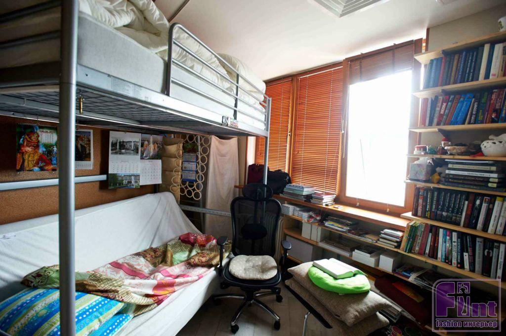 В комнате для гостей — двухъярусная кровать и полки со множеством книг.