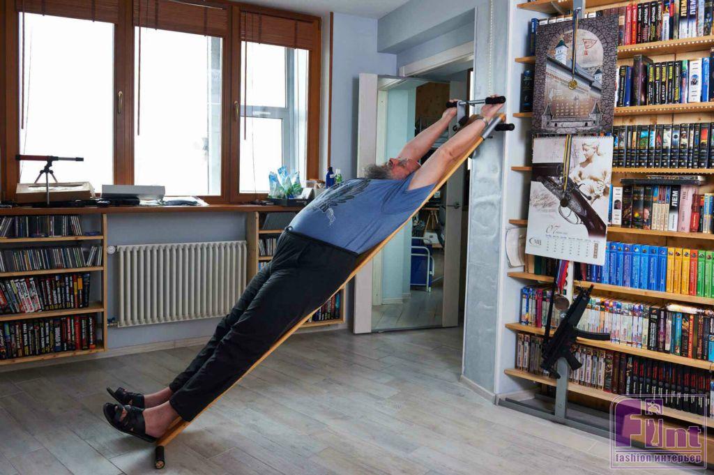 Хозяин жилища показывает нам свои спортивные тренажёры и не только рассказывает, как именно он на них занимается, но и демонстрирует: как он вытягивает позвоночник, как качает пресс.