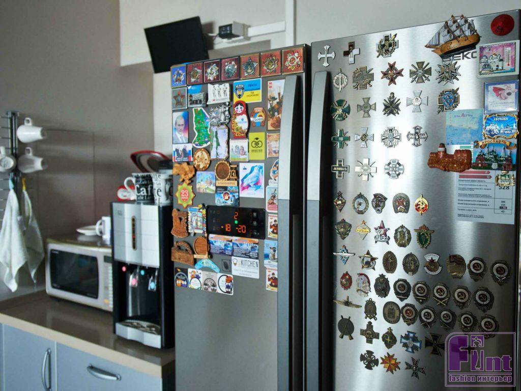 Кухня также отделана в светлых тонах, она с большим окном и множеством необходимых технических устройств, среди которых — микроволновая печь, кофемашина, телевизор с плоским экраном, размещенный на стене, и холодильник, увешанный магнитами со всего света.