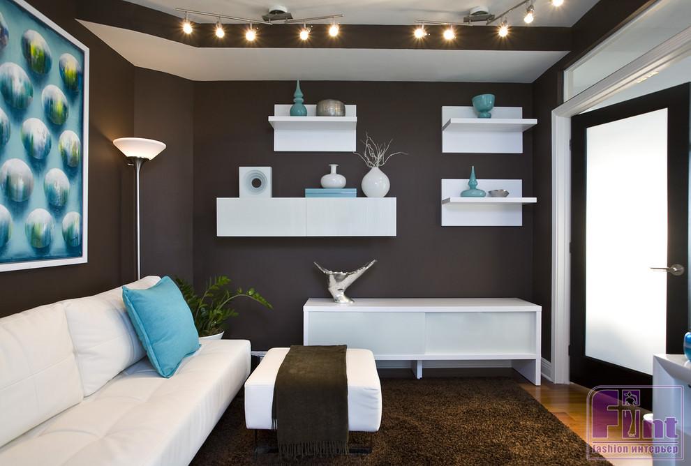 Можно работать по принципу «развития противоположностей»: сделать стены тёмными и контрастными. Они будут смотреться ещё активнее за счёт светлого пола и такого же светлого потолка. Кстати, сочетание тёмных стен и светлого пола делает комнату наряднее.