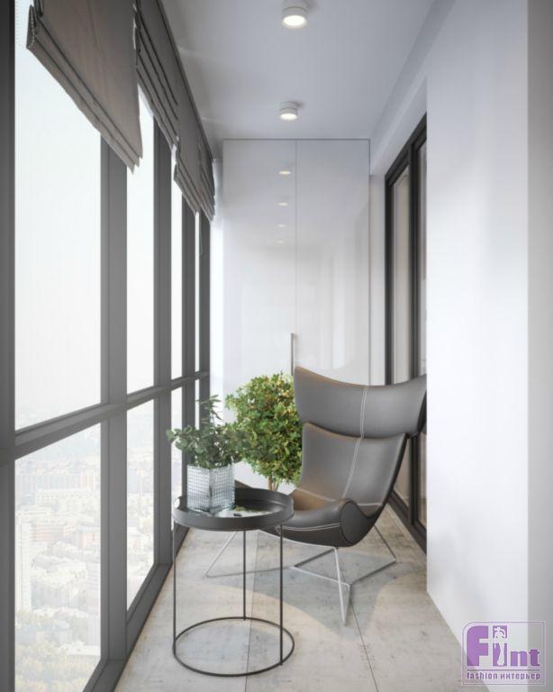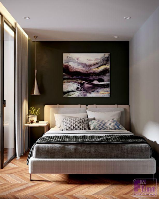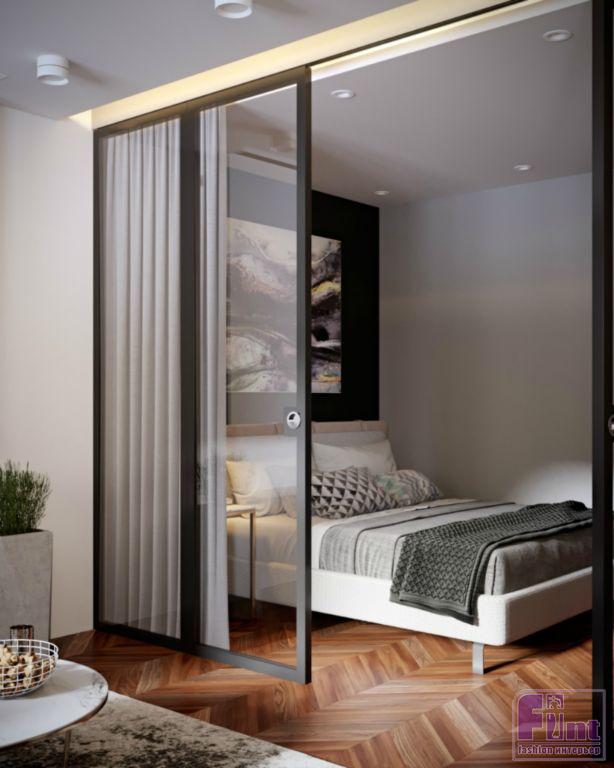 Немало внимания автор проекта уделила функционалу жилища. Помимо общественной зоны, Юлия спроектировала небольшую спальню, гардеробную комнату, санузел и балкон, ставший лаунжем. Скромная по габаритам спальня прекрасно вписалась в пространство квартиры, заняв один из углов помещения. При этом, стеклянные перегородки ничуть не загромождают интерьер, оставляя ощущение простора. За приватность спальной зоны отвечают тщательно подобранные по цвету шторы «в пол», закреплённые на скрытых карнизах.