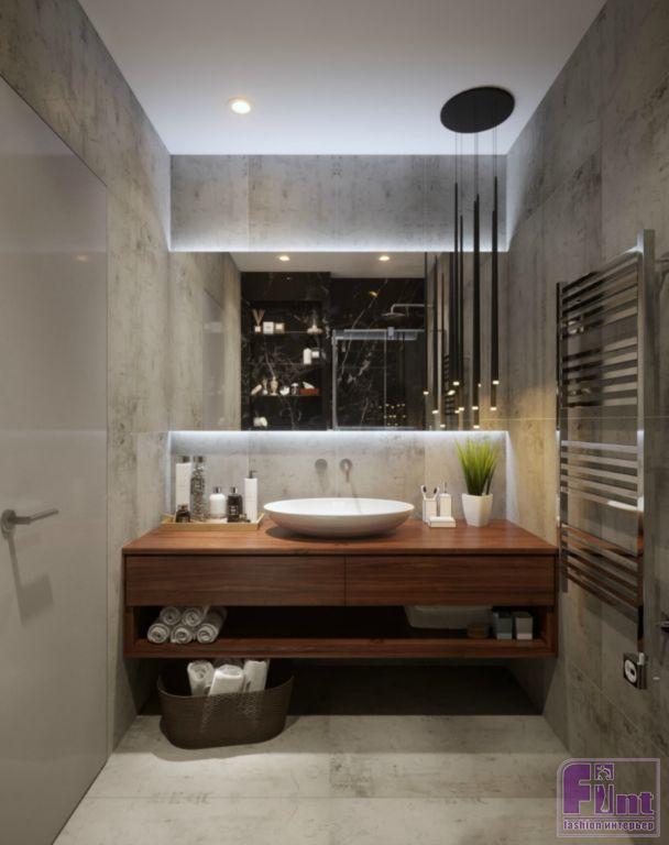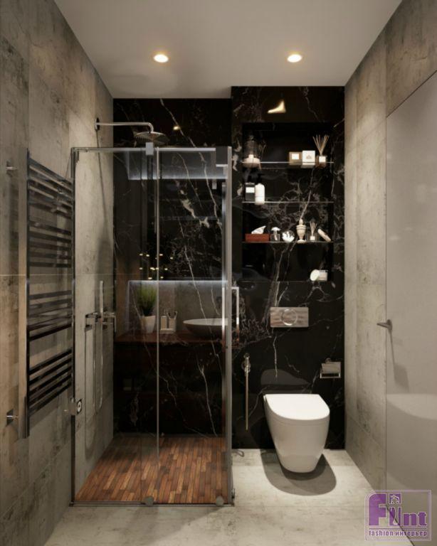 Санузел в квартире, как и всё жильё, не обладает излишками площади, однако дизайнеру удалось поместить в это небольшое помещение всё необходимое, включая довольно просторную душевую кабину и стильную деревянную столешницу под раковиной.