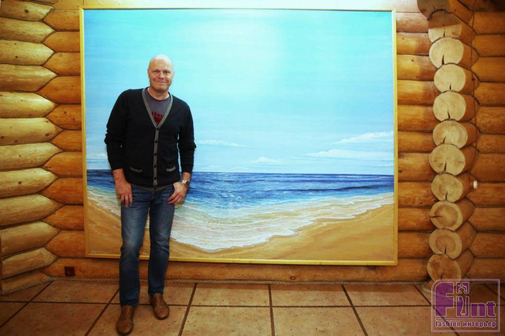 На всех его выставках рядом с картинами установлены светильники, которые меняют цвет, и от этого возникает удивительный эффект «живого» восприятия. Перед тем как подарить нам эту картину, он приехал сюда сам и долго выбирал место, куда её повесить. В итоге решил, что она должна висеть напротив входа и «встречать» гостей. На фоне этой картины хорошо фотографироваться, особенно так, чтобы не было видно рамки. Мы часто делаем такие семейные фото на Новый год, выкладываем в социальные сети — и нас все начинают спрашивать: «А вы на каком море Новый год отмечаете?» (Улыбается).