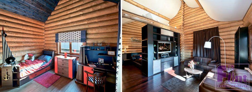 — Проект изначально был придуман с такими балками — похожими на корабельные мачты, — добавил хозяин. — Отсюда и появилась вся эта «корабельная» тема в доме: мы решили перевязать балки канатами, и в детских комнатах — тоже много морской тематики, и в детском спортивном уголке есть канаты для лазания и верёвочные лестницы.