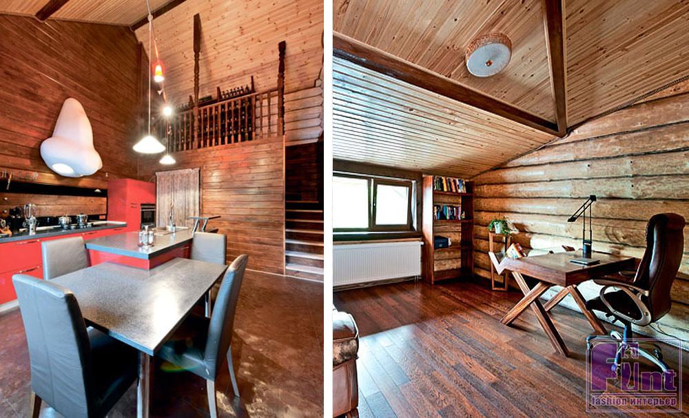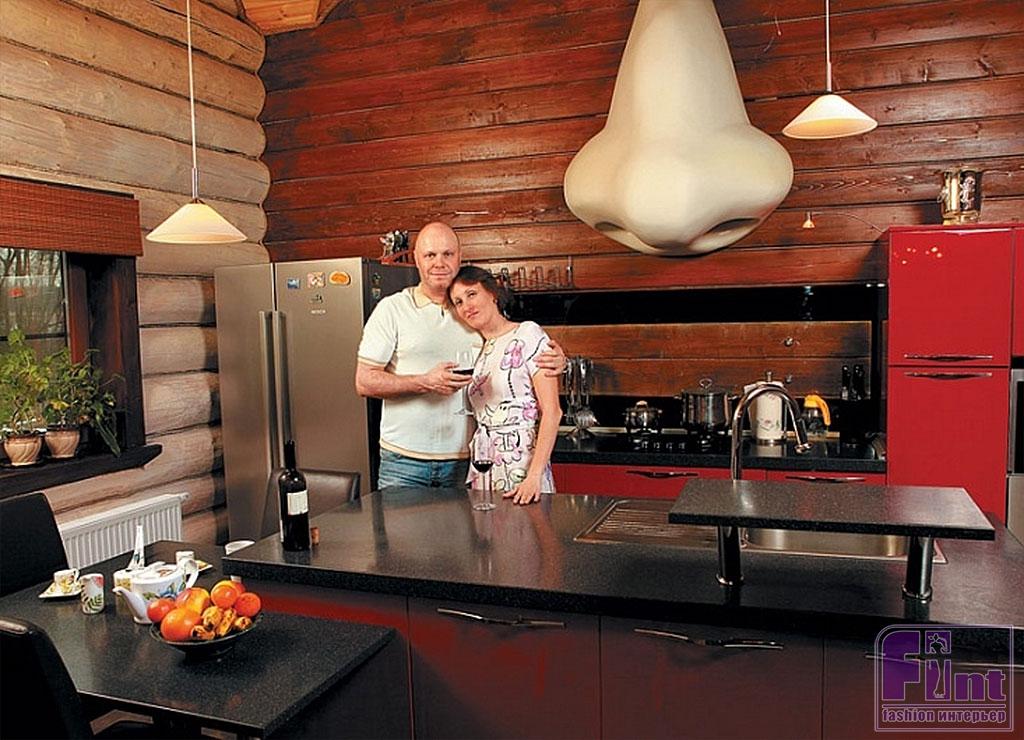 Рядом с гостиной расположена кухня. С деревянными стенами интересно гармонирует кухонный гарнитур, в оформлении которого сочетаются ярко-красный и чёрный цвета. А над плитой — огромный белый нос!