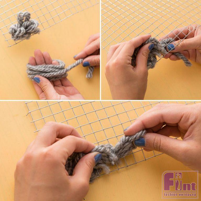 Когда все материалы и инструменты подготовлены, можно приступать к творчеству. В нашем панно мы будем использовать два типа крепления ниток к металлической сетке: «стежки» и «кисточки». Чтобы начать плетение и сделать первый «стежок» по металлической сетке, оберните пряжу вокруг четырех пальцев приблизительно 10 раз. Укладывайте витки пряжи ровно и близко друг к другу. Концы пряжи обработайте, чтобы они не распускались. Затем пропустите получившуюся миниатюрную бухту из ниток сквозь ячейки сетки, формируя «стежок», как от швейной машинки. Свободные концы петель оставьте спутанными. В результате получится небольшой объёмный «помпон».