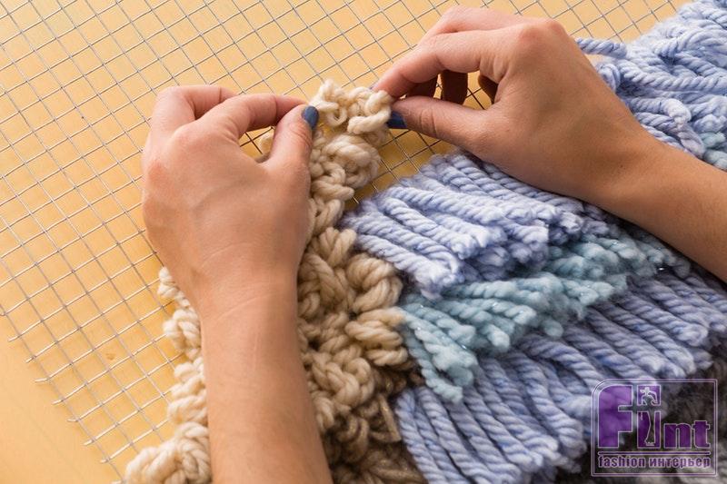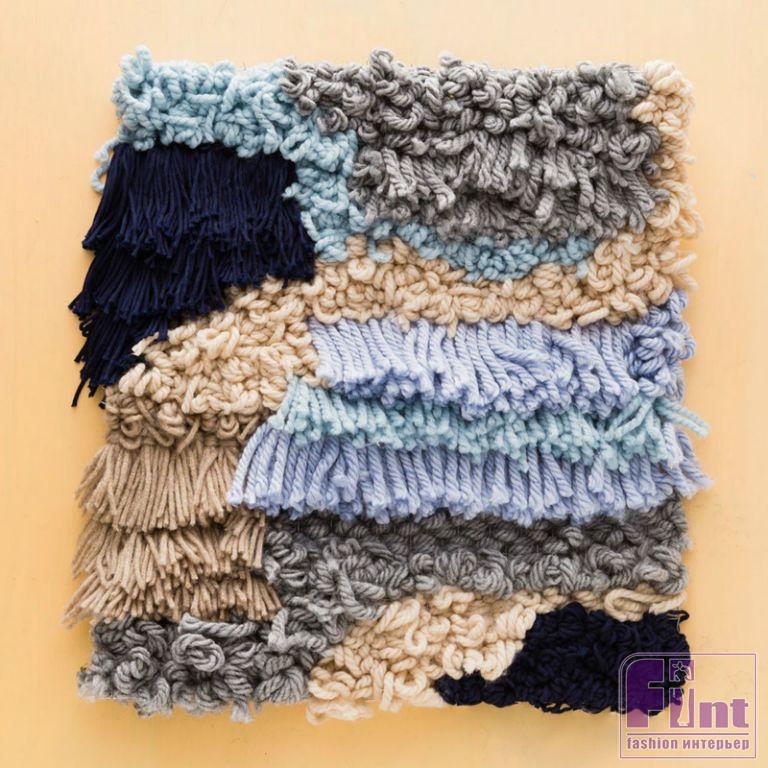 Продолжайте чередовать «стежки» и «кисточки», а также меняйте цвет пряжи, создавая какой-либо узор на вашей основе. Для того, чтобы сделать такое панно, вы можете разработать свой дизайн с цветовой схемой, либо воспользоваться нашим примером. Технология создания этого панно хороша тем, что вы можете сделать его абсолютно любого размера: от небольшого панно формата А4, и до панно, закрывающего половину стены! В среднем, на панно с размерами формата А3 уходит, при определённой сноровке, около трёх часов.