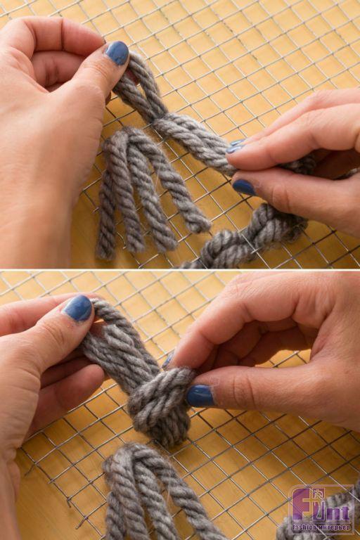 Для создания «кисточек» используйте два 10-сатниметровых отрезка пряжи, которые нужно закрепить в одной ячейке. Пропустите пряжу в виде петли в ячейку, а затем проденьте свободные концы пряжи в сформированную петлю и туго затяните.