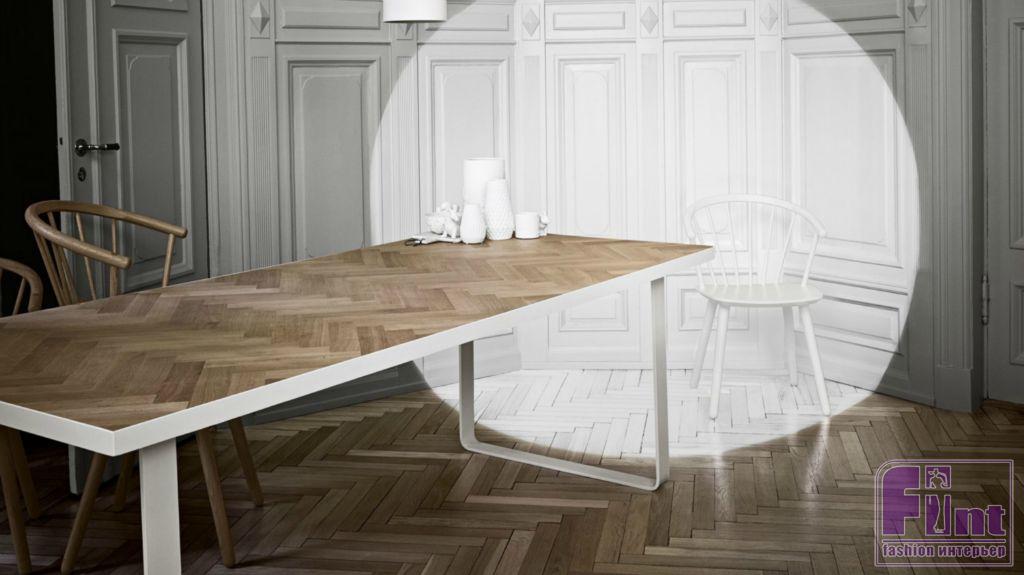 И снова схожая ситуация: паркет-«ёлочка» точно так же, как и венецианский терраццо, — это всего лишь напольное покрытие по первоначальной задумке. Так или иначе, оба направления пошли дальше и расширили границы своего присутствия. Так, «ёлочка» теперь актуальна для столешниц любых размеров: кофейных, журнальных, обеденных и письменных столов.