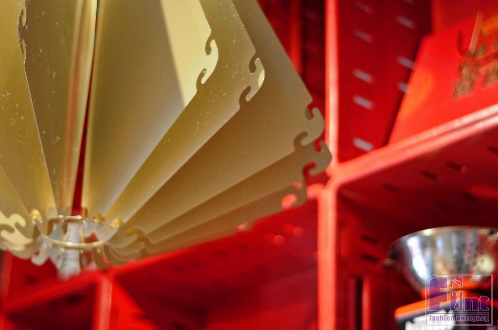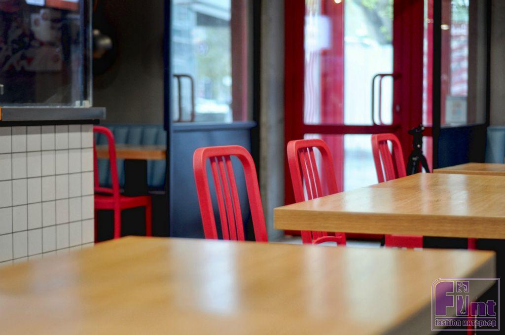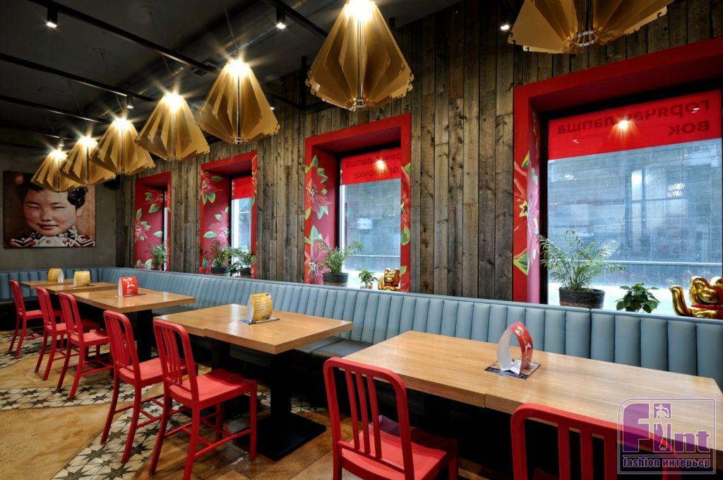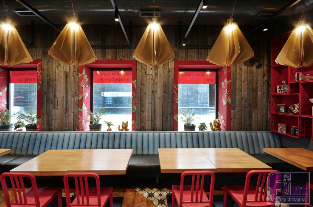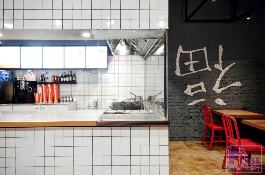 Помещение, которое профессионалы ALLARTSDESIGN превратили в царство восточной еды, представляет собой классическую прямоугольную форму, с окнами, вдоль длинной стены. Заведение имеет открытую для взоров посетителей кухню, что вполне традиционно для азиатских пунктов общественного питания. На открытом огне всего за 1-2 минуты, в небольших, но глубоких традиционных китайских сковородах – воках - при вас готовят свежую лапшу. Верхняя часть стены над стойкой и окном раздачи выполнена в том же декоре что и кухонная стойка: выложена стильной квадратной керамической плиткой белого цвета. Благодаря этому кухня выделена как самостоятельный элемент интерьера, который, тем не менее, очень органично вписывается в яркий интерьер кафе.
