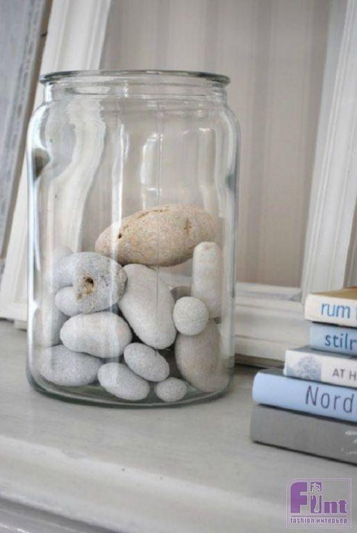 Там, где ракушки, там и морские камушки и отшлифованные волной стёклышки. Даже если эти морские «богатства» будут храниться в прозрачном контейнере из стекла на видном месте – это уже засчитывается как летний декор для дома.