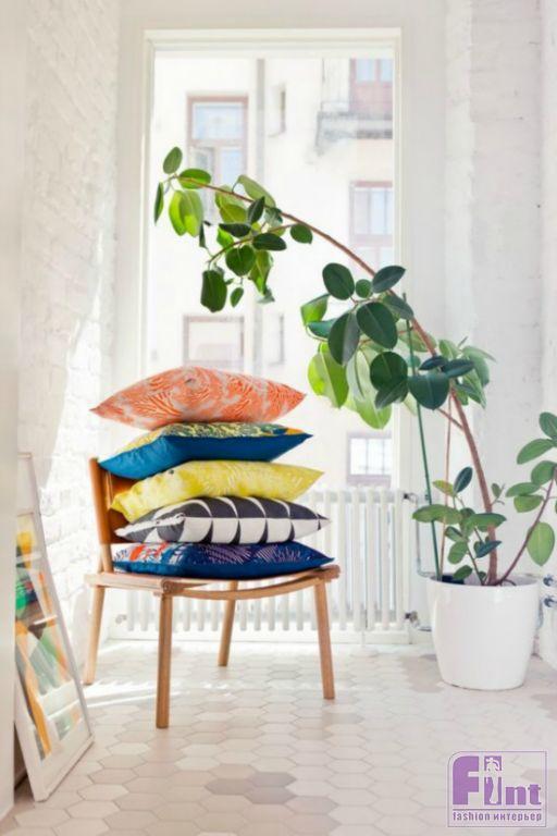 Превратите свою гостиную или спальню в настоящую лаунж-зону для летнего релакса, украсив интерьер многочисленными декоративными подушками самых пёстрых расцветок.
