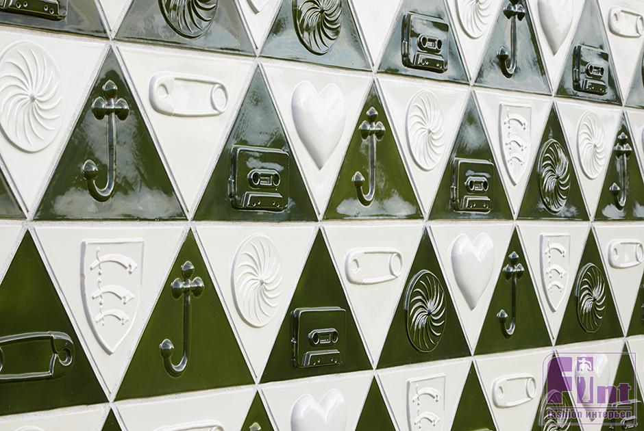 Глазированная разноцветная плитка украшена символами, так или иначе связанными с вымышленной хозяйкой дома: булавка для подгузников, сердце, герб Эссекса, кассета-микстейп, ее инициал J.