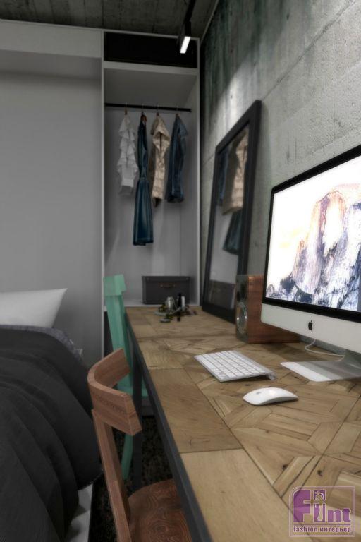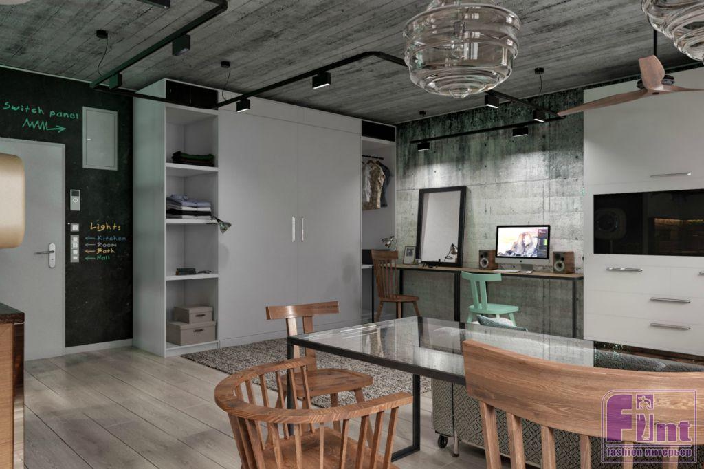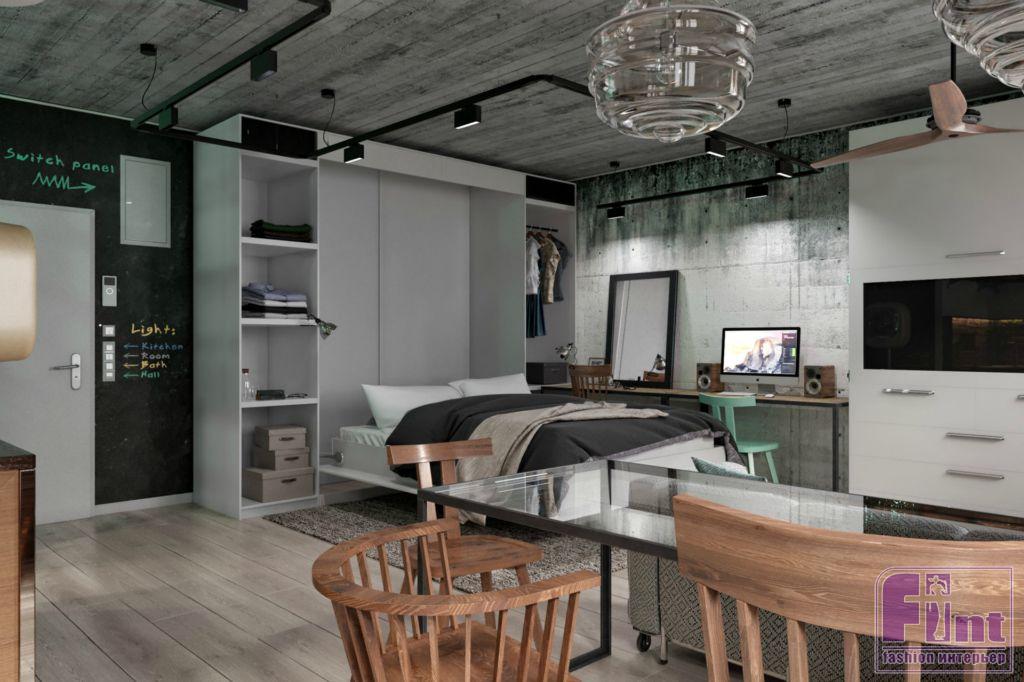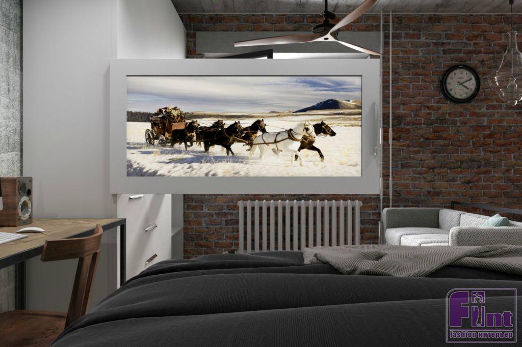 Мобильность интерьера достигается множеством продуманных деталей. Раскладная кровать днём прячется в шкаф, освобождая проход к рабочей зоне с письменным столом. В гостиной зоне секцию с телевизором можно перемещать и смотреть кино не только с дивана, но и с кровати, просто повернув панель на 90 градусов, как обычную дверь у шкафа.
