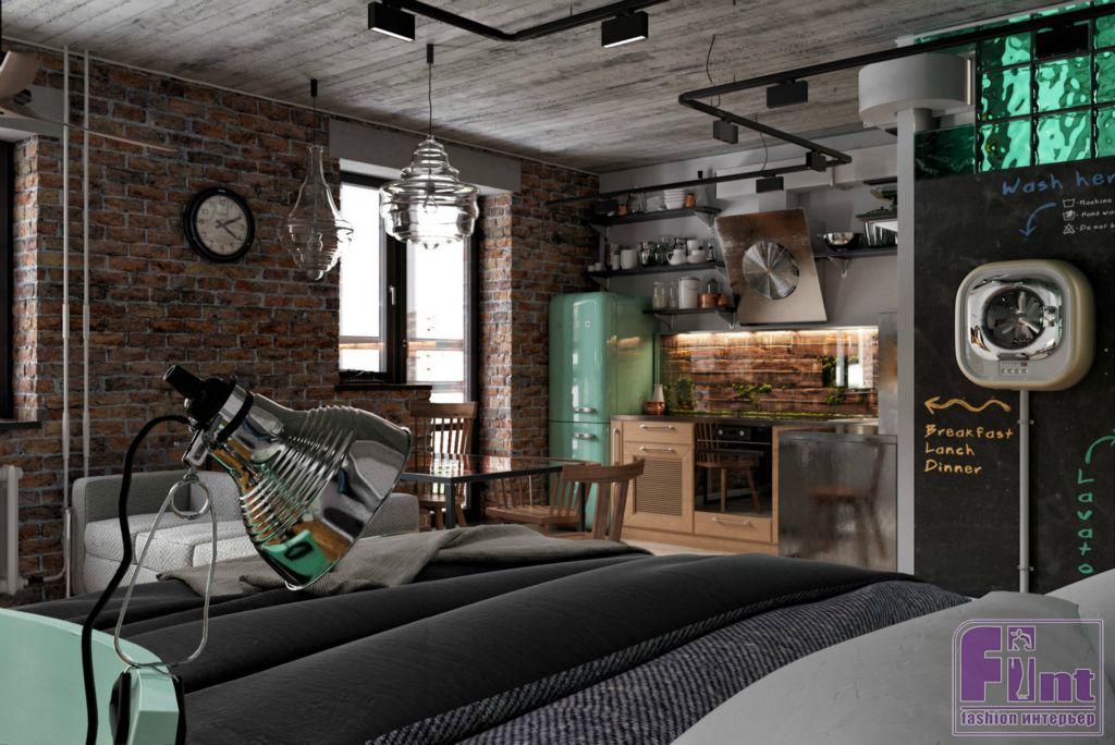 Важное условие для «уютизации» небольшого жилого пространства – продуманные сценарии освещения. За общий свет отвечают потолочные светильники-рейлинги в индустриальном стиле – они словно оплетают потолок сетью. Рядом с кроватью предусмотрели бра, которые крепятся на полку шкафа. Интересная находка для зоны гостиной – люстра-вентилятор: незаменима жарким летом. И, конечно, не забыли про функциональную подсветку обеденного стола и кухни – в интерьере студии продумали всё до мелочей.