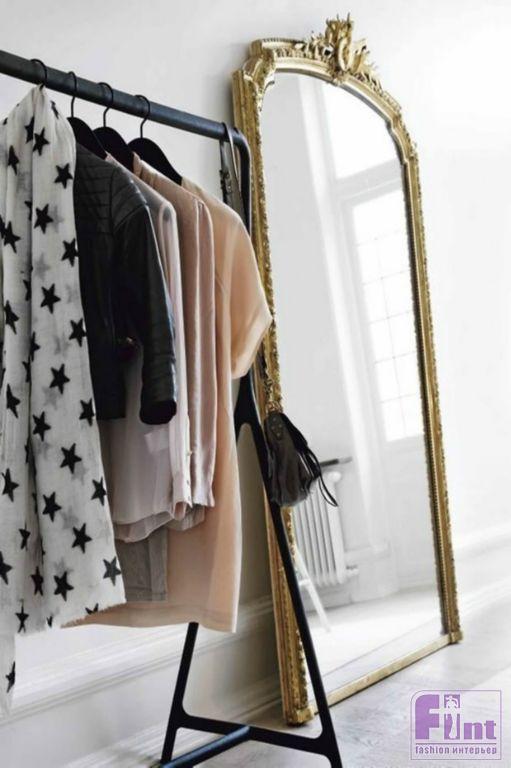 С закрытыми системами хранения всё просто – можно сделать зеркальные дверцы у шкафов. Если вы отдали предпочтение открытой развеске, с поиском места для зеркала придётся повозиться – понадобится свободная стена или угол. Если у вас маленькая квартира, это может стать настоящей проблемой. Особенно, если хочется иметь большое заркало, отражающее вас в полный рост.