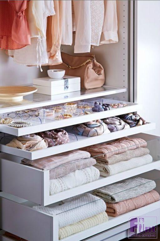 Развесить красиво свитера и топы – эта задача может превратиться в настоящий квест. Сделайте ставку на выдвижные ящики и складывайте в них вещи стопками или скручивайте «рулетиками» по методу Мари Кондо.