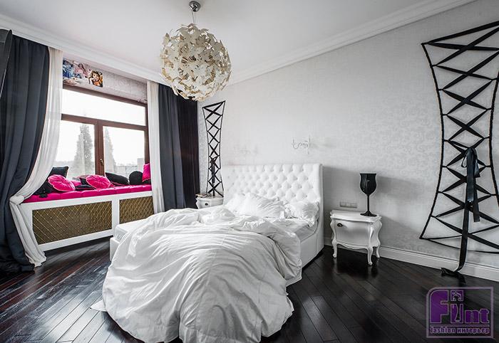 Что касается отделки комнаты, то на полу — тёмный тик, стены выкрашены в белый цвет, двери выполнены из дуба на заказ отечественными мастерами, а окна — деревянные стеклопакеты, декорированные белыми занавесками и шторами из чёрного бархата. Чтобы не было совсем уж скучно, я разбавила чёрно-белую гамму яркими акцентами цвета фуксии.