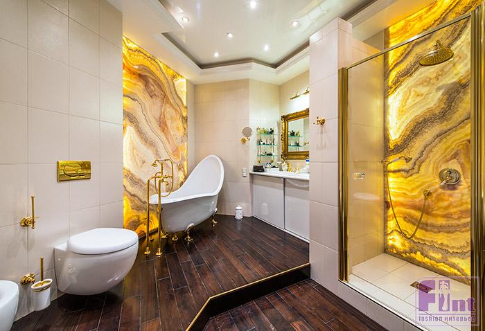 Да, эффект роскоши создан за счёт сочетания «солнечного» цвета подсвечивающихся панелей из оникса (в зонах ванны и душевой кабины), золотистых смесителей и аксессуаров, позолоченной рамы зеркала и необычной ретроформы отдельно стоящей ванны на ножках. На полу — натуральный тик со специальной масляной пропиткой, а не холодная плитка. Это было для меня принципиально важным моментом в оборудовании ванной комнаты. Таким образом, создаётся атмосфера комфорта. Да и босиком стоять на дереве, а не на камне, пусть и с подогревом, гораздо приятнее.