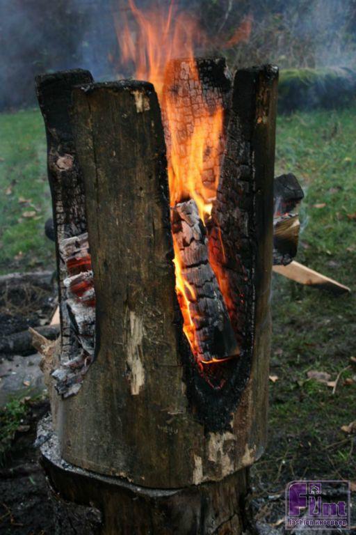 Важно проводить все «огневые» работы с соблюдением мер пожарной безопасности. Лучше всего, если у вас есть место за городом, на котором вы можете безбоязненно осуществлять «контролируемые поджоги». Чтобы изготовить такой табурет необходимо выбрать подходящее по диаметру полено, разметить его крест-накрест и начать «зажигательную» часть процесса. Из обычного костра достаются самые горячие тонкие поленья, которые укладываются на сверху на наш будущий табурет. Именно они создадут необходимый рельеф за счёт сгорания лишних частей полена. По мере углубления огня в полено следует поддерживать температуру и режим горения, оставляя «ножки», которые, при необходимости, можно обрызгивать водой.