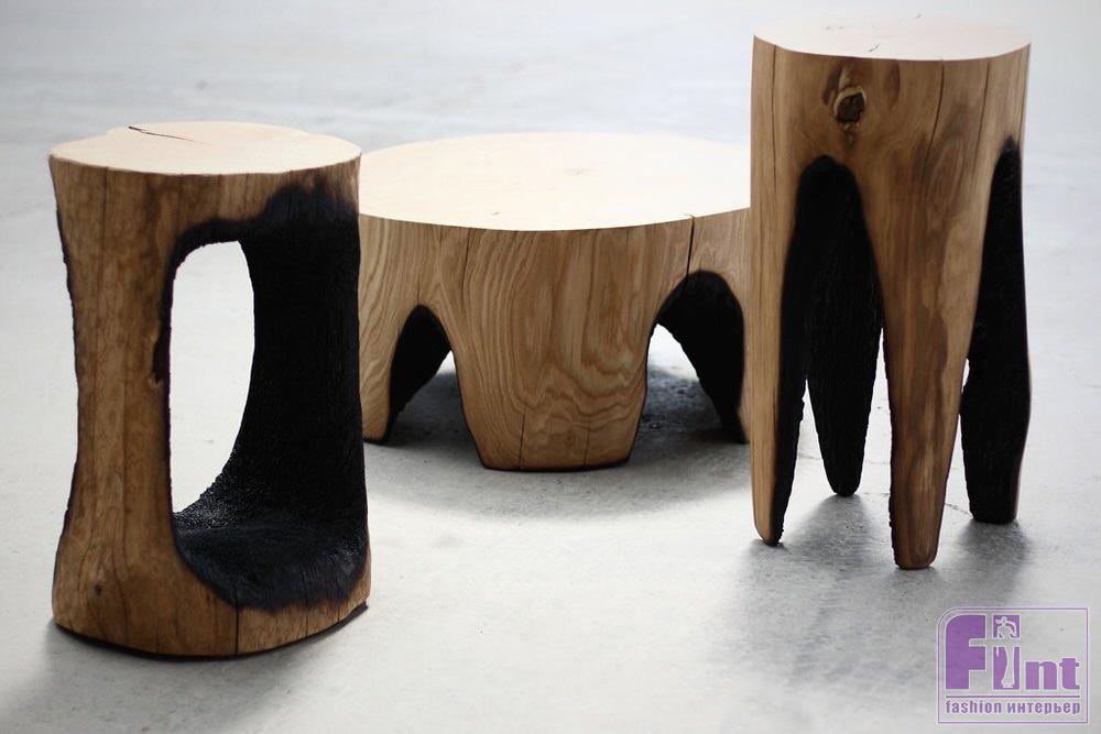 Поскольку обожжённое дерево сегодня является одним из самых модных трендов в строительстве и отделке загородных домов, такие рукотворные табуреты создадут модный интерьер в этностиле и добавят вашему загородному дому или квартире особого шарма и индивидуальности.