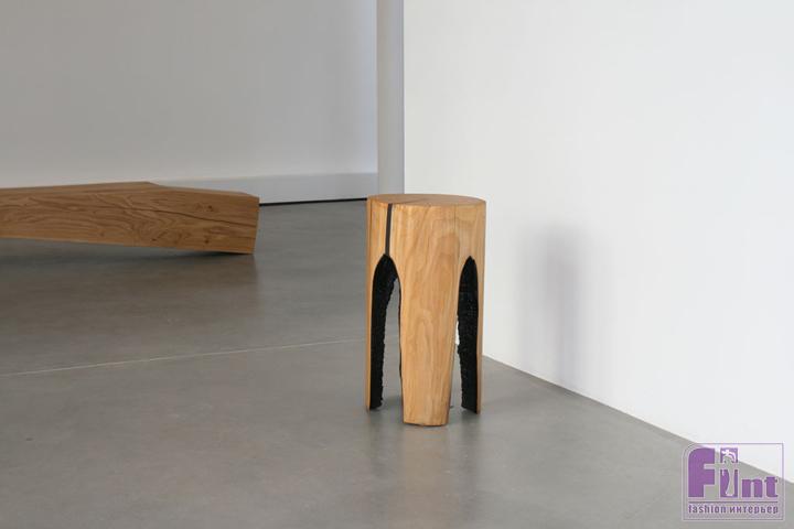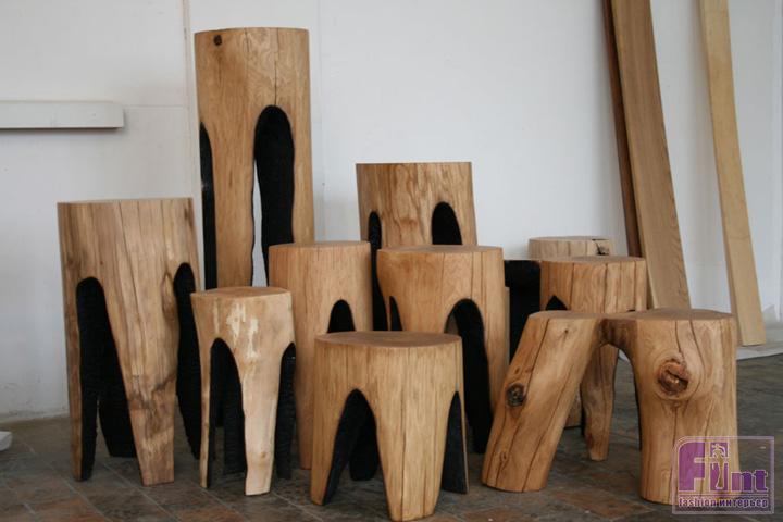 Эта коллекция табуретов была представлена художником зимой в Стокгольме на ежегодной международной мебельной выставке. Серия табуретов называется «Ausgebrannt», что значит – «сгоревший». Мебель, изготовленная таким образом, очень близка к этностилю. Так и видится свита короля Артура, расположившаяся на обглоданных пламенем корягах, вытащенных из огня, поближе к своему суверену. Из-за любви к пламени и дереву, художник отказался от городской мастерской и перебрался жить в лес, поближе к природе. Там у него личный дом и ничто не мешает творить.