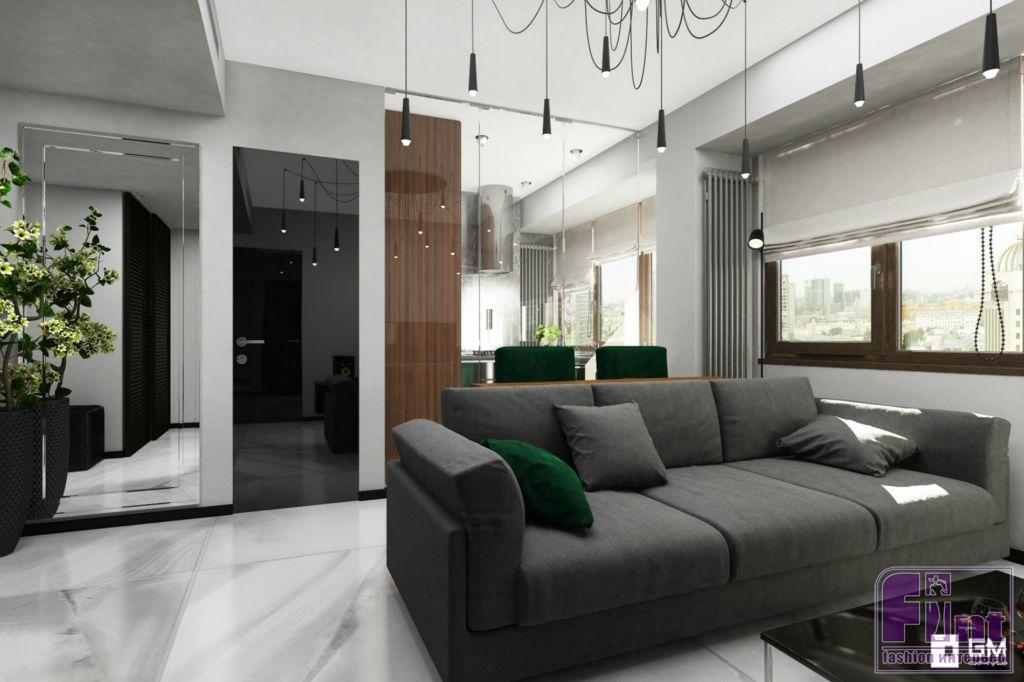 Просторная гостиная, несмотря на общую монохромность, выглядит довольно уютно и нескучно, благодаря наполненности светом из широкого панорамного окна. Римские шторы светлого оттенка не снижают освещённость, но в то же время, создают необходимый уровень приватности. При этом, гостиная, несмотря на свои скромные габариты, способна вместить довольно большую группу людей с необходимым уровнем комфорта. Изюминку интерьеру гостиной и кухни придают деликатный и дозированный акцент фактуры дерева, диванная подушка и обивка стульев изумрудно зеленого цвета, а также стильный подвесной светильник с множеством источников света, создающих ощущение простора.