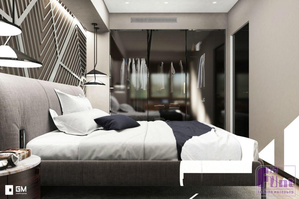 Стена за изголовьем кровати в спальне декорирована металлическим панно по эскизам дизайнера студии. В строгом соответствии с пожеланиями заказчика в спальне нашли место и вместительной гардеробной, и просторной кровати. В результате довольно брутальный интерьер квартиры выглядит очень домашним и упорядоченным.