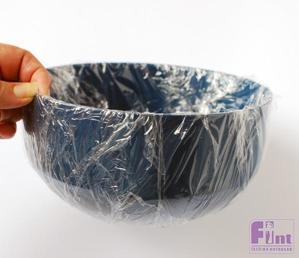 1. Возьмите первую глубокую тарелку, которую вы выбрали в качестве формы для будущей вазы. Это может быть глубокая тарелка, миска, пиала или что-то аналогичное. Оберните пищевой плёнкой наружную сторону тарелки. Убедитесь, что все концы плёнки плотно прилегают к тарелке.