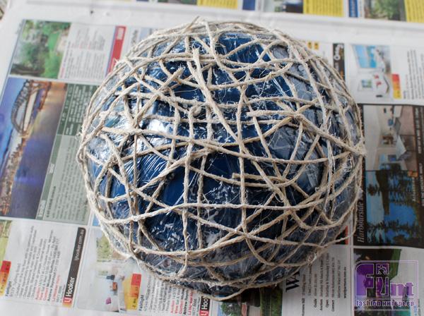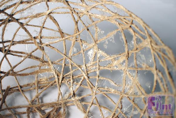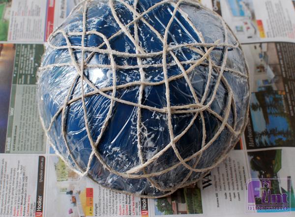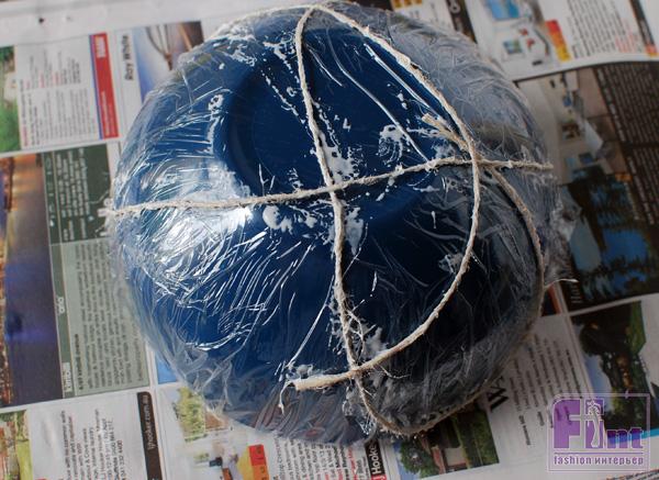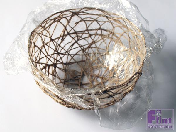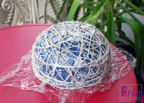 4. Возьмите первую глубокую тарелку, обмотанную пищевой пленкой, и в случайном порядке начинайте укладывать пропитанные полоски бечёвки. Загибайте и переплетайте бечёвку на ваше усмотрение, фантазируйте и создавайте узоры.