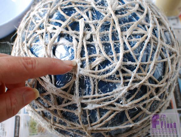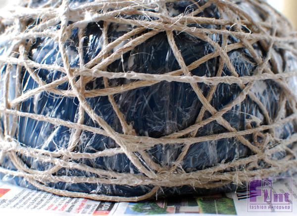 6. Далее необходимо укрепить все места переплетения бечёвок между собой. Для этого на все соединения нанесите пальцем или кистью раствор для придания жесткости ткани. Этот шаг очень важен, так как он обеспечивает жёсткость и целостность вашей вазы.