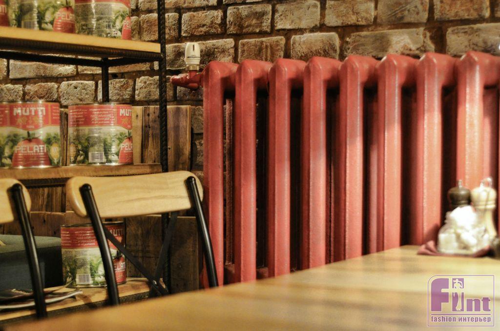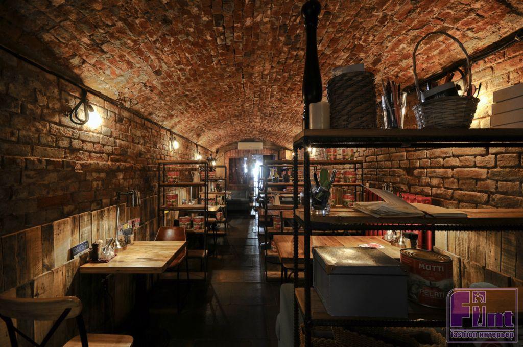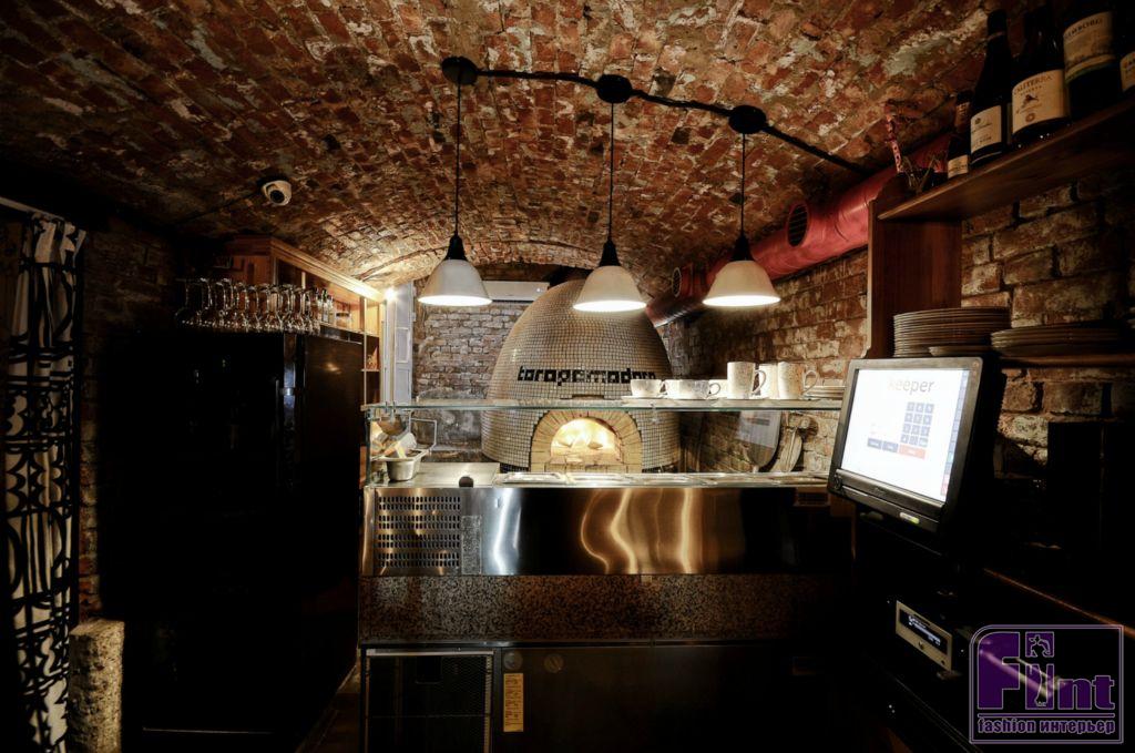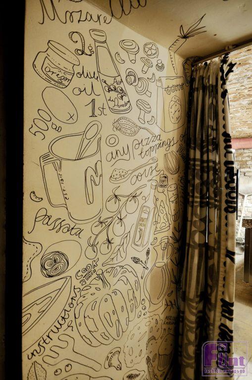 Помещение пиццерии довольно скромных габаритов - всего 38 кв.м. - имеет невероятно красивый сводчатый потолок из 100-летнего красного кирпича и прямоугольную, вытянутую форму. Здесь расположена открытая кухня и зал для посетителей. Интерьер наполнен простыми и натуральными материалами, такими как металл и настоящее американское дерево, заказанное в США. Арка в санузле декорирована авторской росписью. Артемий Саранин украсил стены и потолок маркерной техникой, взяв за основу легко узнаваемые образы ингредиентов классической пиццы.