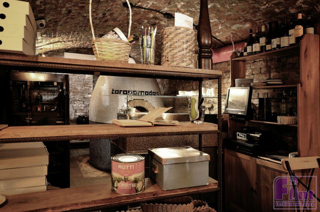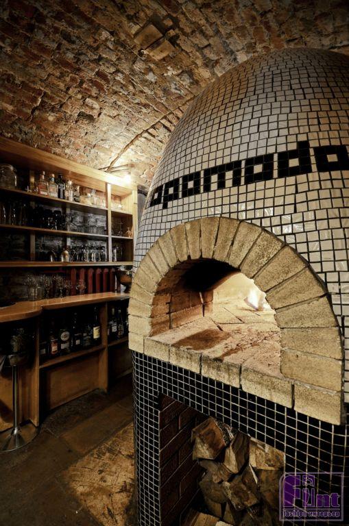 Для проекта пермской пиццерии «TOROPOMODORO» была разработана настоящая дровяная помпейская печь, которая стала своеобразной визитной карточкой пиццерии. Свод печи выполнен в виде полусферы, поэтому горячий воздух внутри печи циркулируют снизу вверх, осуществляя приготовление пиццы. Уникальность созданной для пиццерии печи не только в механизме её работы, но и в оригинальной «яйцевидной» форме купола. Снаружи печь облицована мелкой керамической мозаикой: купол – белой, основа печи – контрастной, тёмной. Из такой же тёмной мозаики на лицевой части купола печи, обращённой к посетителям, выложено название пиццерии - «TOROPOMODORO».