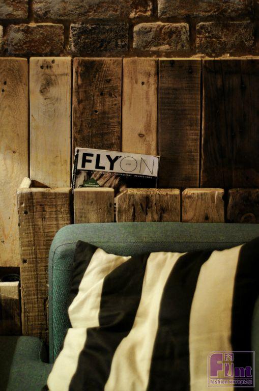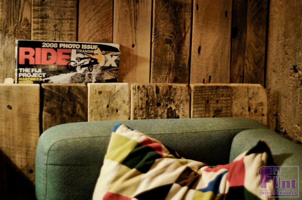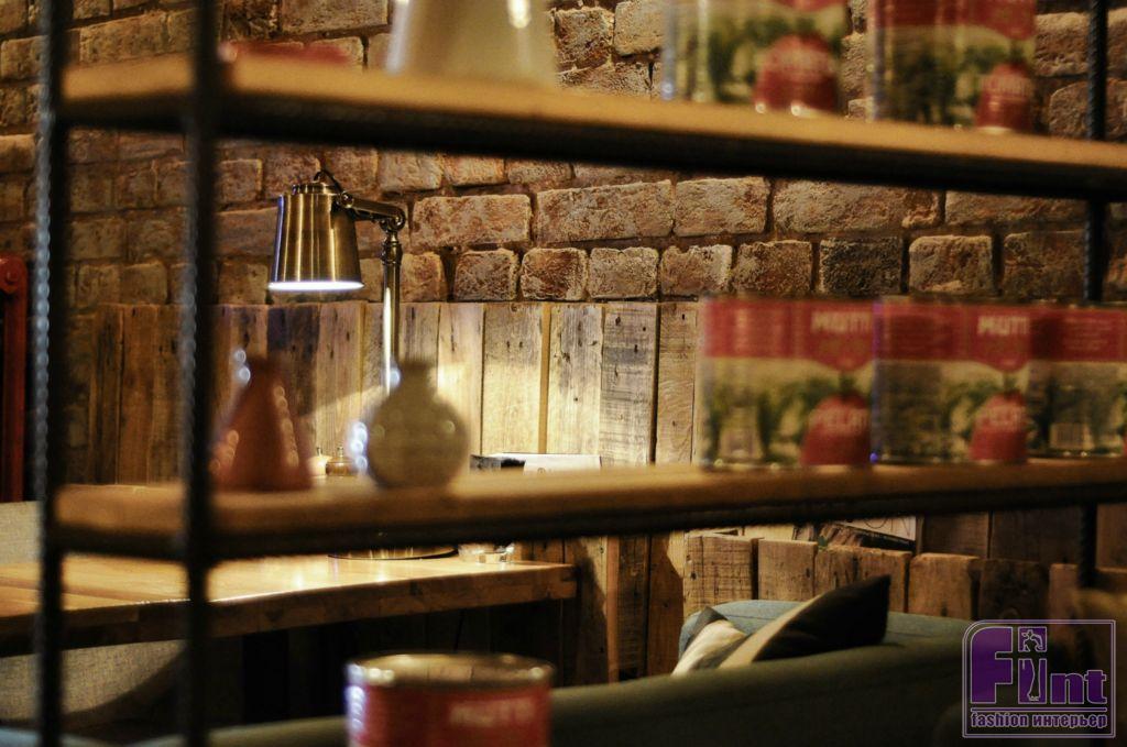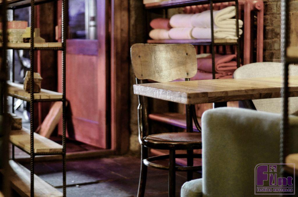 Посадка, помимо классических деревянных стульев, включает и мягкие диванные группы, украшенные яркими декоративными подушками с геометрическим орнаментом. Зонирование зала выполнено при помощи оригинальных стеллажей, сваренных из обычной толстой арматуры, на которой закреплены почти не обработанные деревянные полки довольно брутального вида.