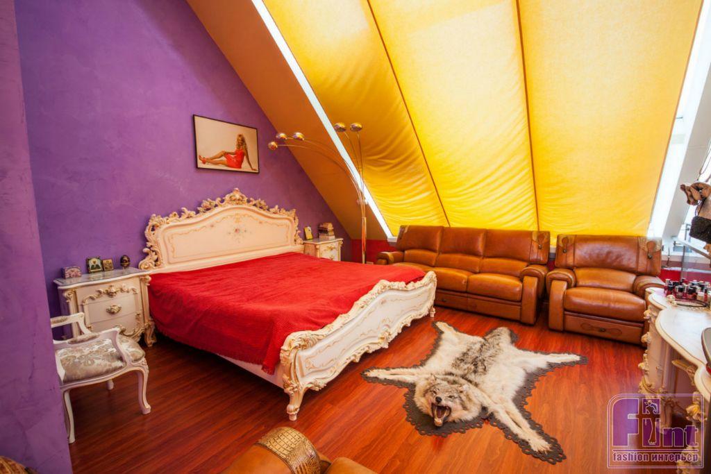 Здесь организованы каминная зона с действующим камином и моя спальня с примыкающей к ней ванной комнатой. В интерьере каминной много фигурок орлов, поскольку я коллекционирую изображения этих гордых птиц с громадным размахом крыльев. Также тут имеются декоративные вазы из Азии, оригинальная лампа со скрипкой в основании, старинный патефон из Иордании. А спальный гарнитур цвета слоновой кости с золотом (кровать, тумбочки и туалетный столик с зеркалом) заказан мною всё в той же итальянской фирме, что и мебель в зоне гостиной. На фоне фиолетовых стен он выглядит идеально. Вообще я, едва переступив порог этого дома, уже начинаю испытывать удовольствие. Не представляете, какое счастье — ощущать, что всё это принадлежит тебе и сделано тобою же. Так что, можно сказать, я — хозяйка квартиры-мечты.
