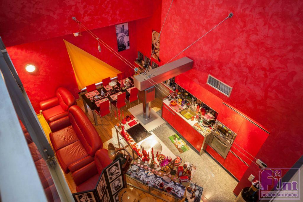 Мне так не терпелось поскорее сюда вселиться, что ремонт занял всего четыре месяца. Никаких стен мне сносить не пришлось, поэтому кардинальной смены планировки не было. От предыдущего владельца остались металлическая лестница на второй этаж; прочное стекло, служащее на втором этаже мостом между жилой зоной и крышей; «диджеевская» рубка на втором этаже; серый санузел — на первом (в нём я установила синий мойдодыр и джакузи). В целом я изменила лишь колористику интерьера. Я обожаю вдохновляющий красный цвет, поэтому стены первого — гостевого — этажа отделаны венецианской штукатуркой именно такого тона. Кстати, венецианскую штукатурку накладывал мастер, специально обучившийся этому ремеслу в Милане. В кухне-столовой также преобладает красный. И так как я неравнодушна к стеклу, то в столовой зоне и стол (окружённый стульями с красной кожаной обивкой) стеклянный, и барная стойка — тоже. К барной стойке подобраны деревянные стулья, по тону совпадающие с паркетом на полу. А стол украшают старинные подсвечники. Как видите, мне нравится совмещать вроде бы несовместимое, даже допускать некий китч.