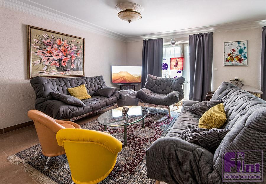 Да, кстати, есть ещё три застекленные лоджии, но которых также здорово посидеть, и три санузла, что очень удобно, когда собирается много друзей. Мебель в гостевую покупал сам: необыкновенно удобные тёмно-серые диваны и кресло, небольшие стулья-кресла — цветные, забавные, для настроения. Есть настоящий киношный софит, который я взял на «Мосфильме» и отреставрировал. Естественно, моё приобретение — тяжёлые плотные шторы, поскольку я «ночной» человек, и яркий солнечный свет по утрам мне мешает. Здорово, что в квартире есть хозяйственное помещение и много вместительных встроенных шкафов.