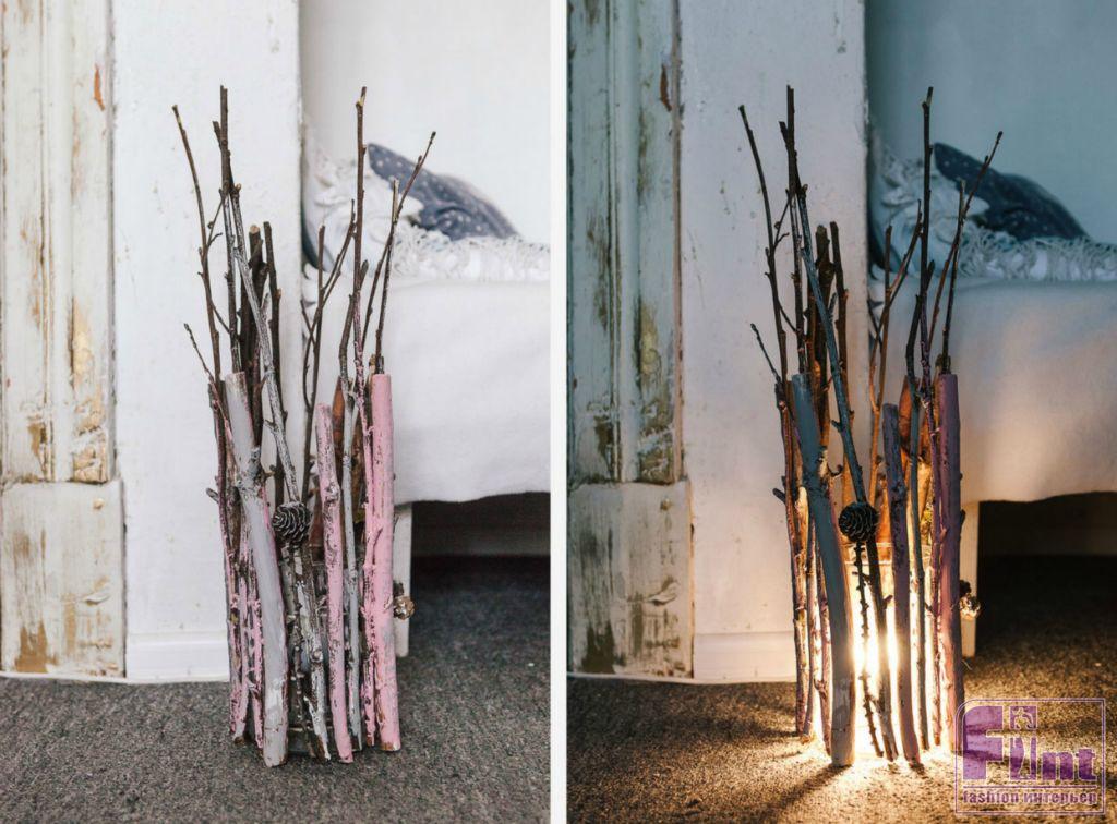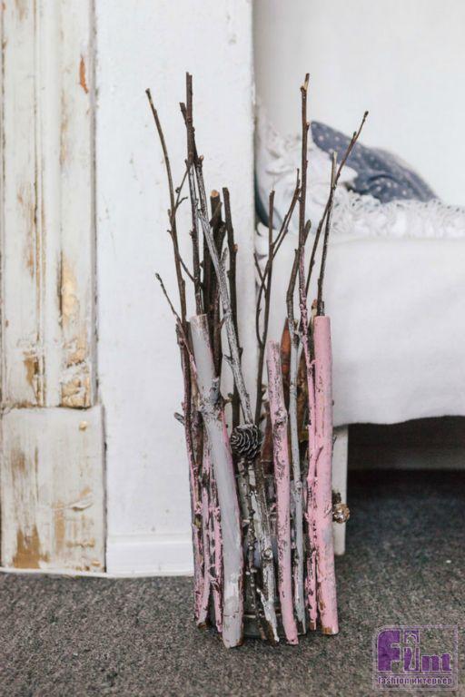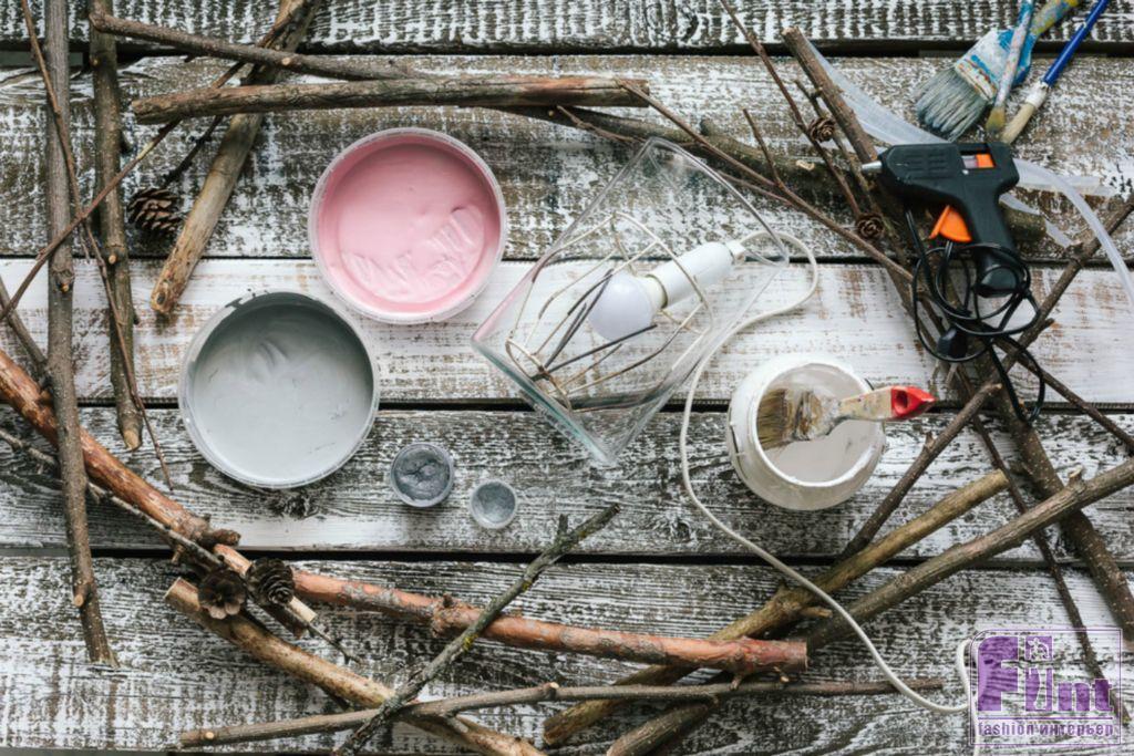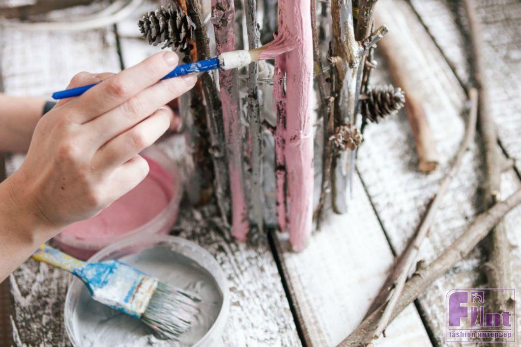 Оставшиеся веточки окрашиваем розовой краской. Красить веточки можно нарочито небрежно, оставляя нетронутыми участки с красивым натуральным цветом дерева. Скорее наше окрашивание сводится к «мазкам» по внешним сторонам веточек, что позволит придать светильнику стильный внешний вид.